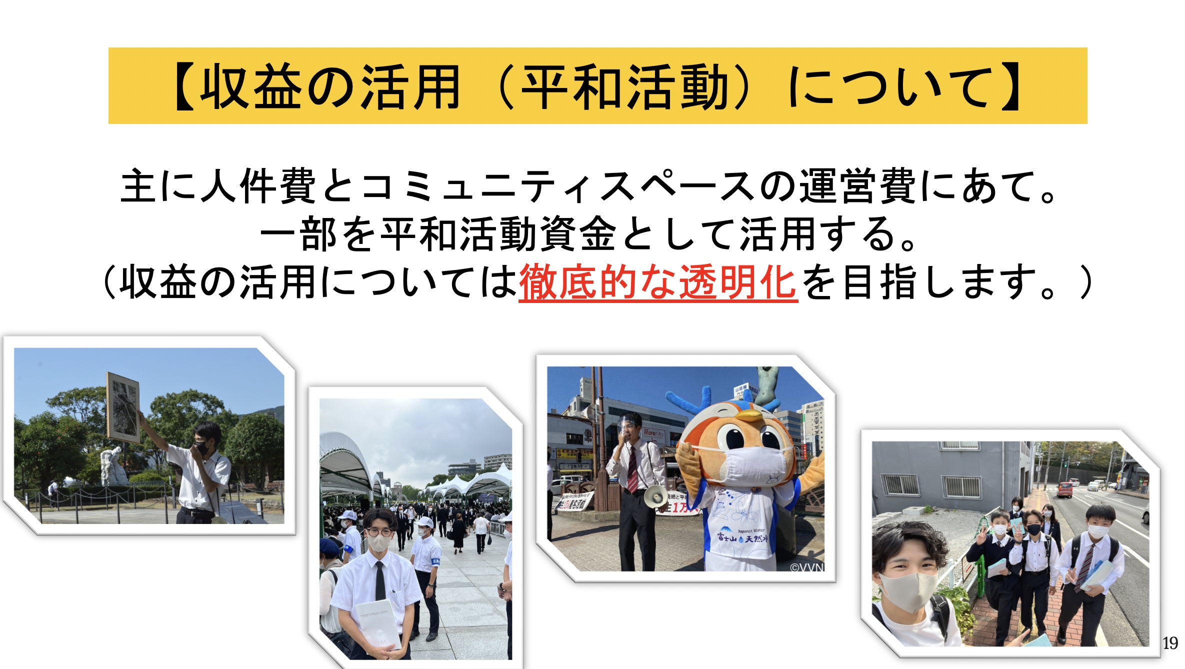 広島を比較対象とすると長崎の平和ブランドの発信は欠けている。県外、国外からも多くの観光客がくるなか、お土産などグッツでの発信は圧倒的にない。それらをわたしたちがオリジナルでデザインし販売していくもの。テーマはもちろん平和や長崎をイメージとしたもの。例えばシャツは3000円以下とし、売上の一部を若者が活動するため寄付する。