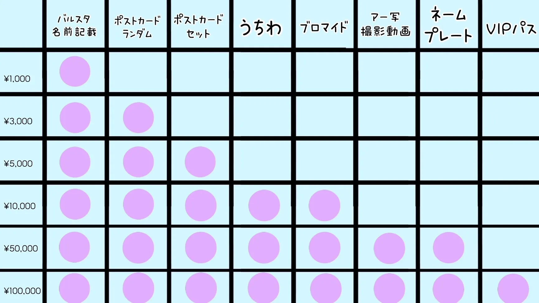 ※丸がついている項目が各金額のリターン品になります。