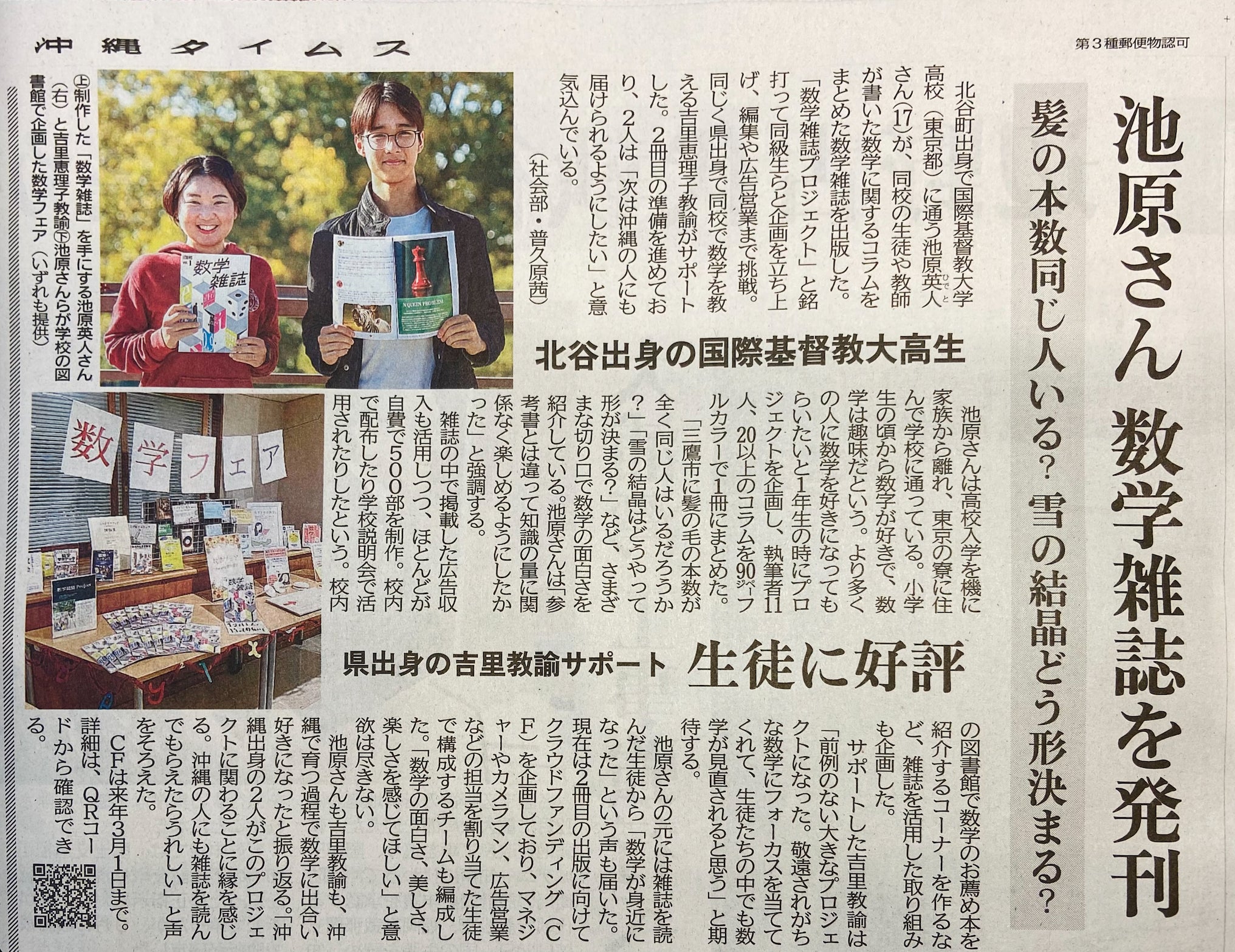 2023/12/27 08:45ICU高校数学雑誌が新聞に記載されました!発行人池原と顧問吉里教諭の故郷である沖縄の地元紙に取り上げていただきました。沖縄タイムスの皆さん、ありがとうございました。OKINAWA TIMES沖縄タイムス12月24日(日曜日)また、朝日新聞デジタル、Yahoo!ニュース、au Webポータル、Rakuten Infoseek、docomoニュース、gooニュースなど、様々なプラットフォームで記事が取り上げられました。感謝の想いでいっぱいです。引き続き応援をよろしくお願いいたします!----------------------------------------------------------------------------------------------------------------------新聞記事のリンクを添付します。ぜひお読みください!沖縄タイムス:https://www.okinawatimes.co.jp/articles/-/1279266朝新聞デジタル:https://www.asahi.com/articles/ASRDS5TNQRDSDIFI003.htmlYahoo!ニュース:https://news.yahoo.co.jp/articles/8b37dd271b30605b7e4cf50072be8e2f499b9012Rakuten Infoseek:https://news.infoseek.co.jp/article/okinawatimes_1111490801617077026/d menu ニュース:https://topics.smt.docomo.ne.jp/article/okinawa/region/okinawa-20231224115200goo ニュース:https://news.goo.ne.jp/topstories/region/goo/da625feed1d4b30c6e6f0942195f2f80.html もっと見る