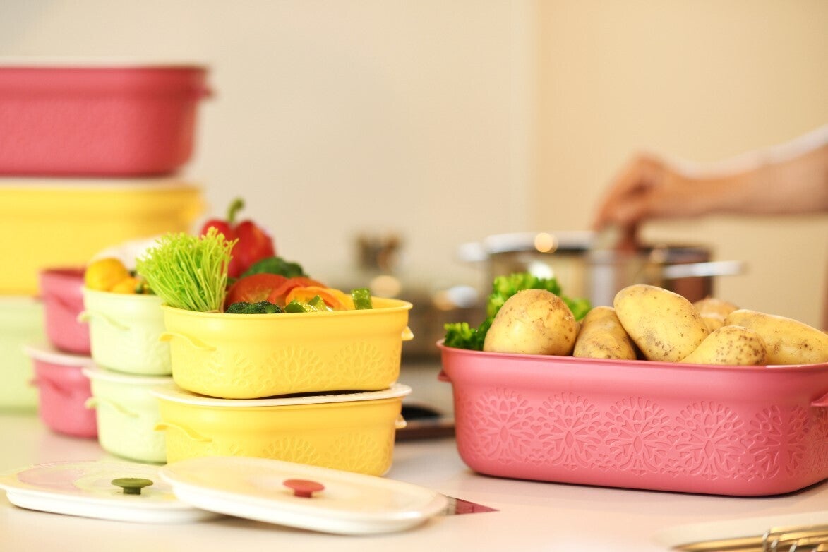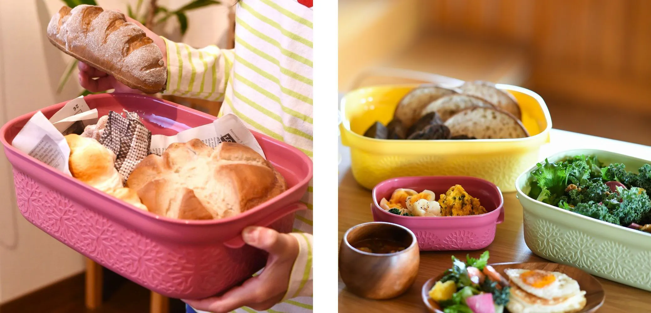 カラフルなカラーバリエーションやデザインはキッチンでの保存容器としてはもちろん、