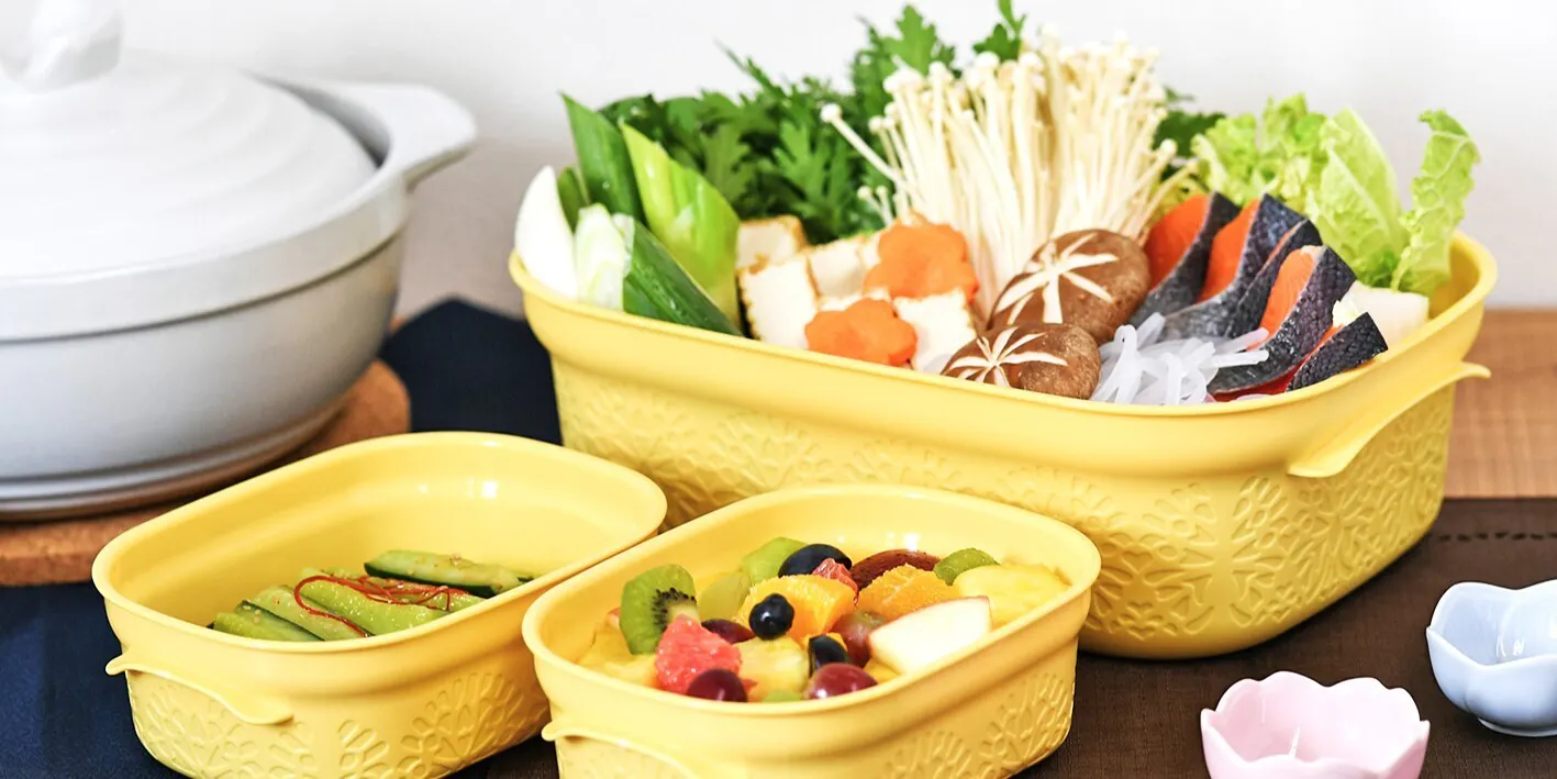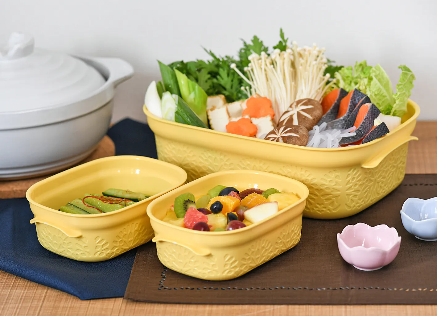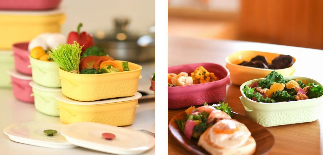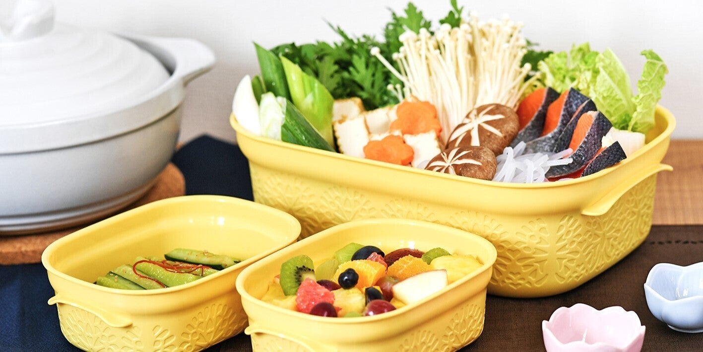 今までになかった、食卓を華やかに演出できる日本製の食品密閉保存容器です。