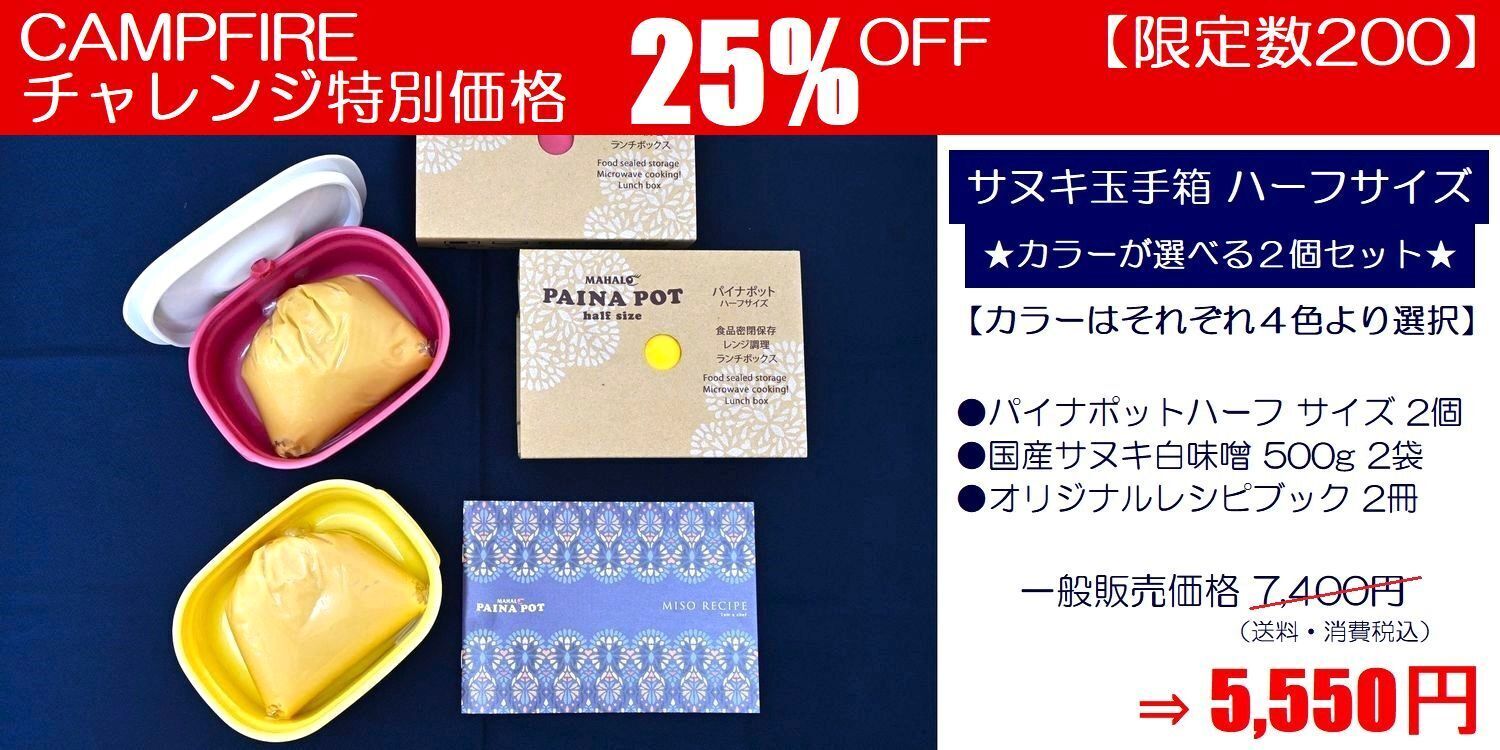 2024/03/15 15:56みなさまのご支援で目標金額に達成することができました!ご支援いただけたみなさま本当に有難うございます。当初の目標金額に達成することができましたが、皆様の温かいご支援にお応えできるよう、サヌキ玉手箱プロジェクトは更なる目標に向けて『ネクストゴール50万円』を目指してまいります!残り16日で当初目標の倍の金額である50万円をネクストゴールに設定するのは実際とてもハードルが高いのですが、、目標とはゴールを決めて努力して、そしてその成功を明確にイメージできなければ達成できないと感じています。ですので作り手としてサヌキ玉手箱はもちろん、パイナポットやマハロバスケットの持つ可能性を信じ、高い目標の『ネクストゴール50万円』を目標に残り16日間走り続けたいと思います!引き続き『サヌキ玉手箱プロジェクト』への応援をよろしくお願い申し上げます。 もっと見る