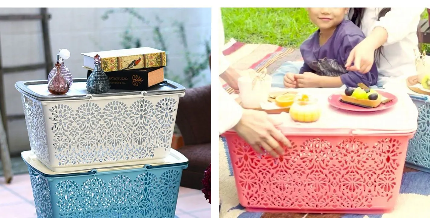 パレットを組み合わせればバスケットを積み重ねて収納に使えるほか、行楽やアウトドアではバスケット・リィがミニテーブルとして大活躍します♪