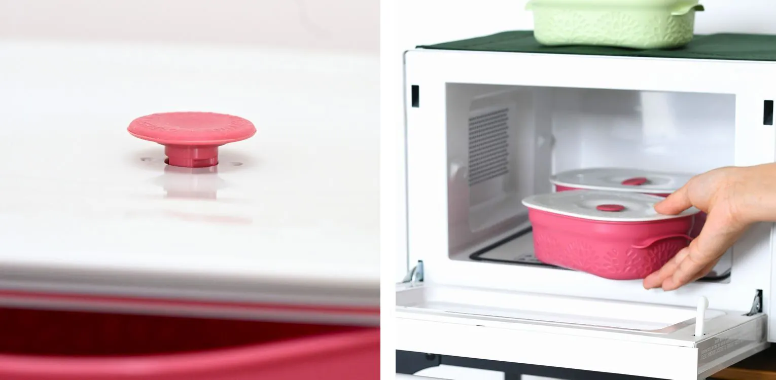 またフタに付いているエアーバルブを引き上げれば蓋をしたままで電子レンジでの温めも可能!