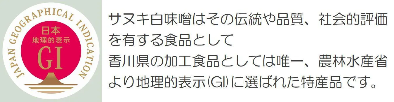 またサヌキ白味噌はその伝統や品質、社会的評価を有する食品として香川県の加工食品としては唯一、農林水産省より地理的表示(GI)に選ばれた特産品です。