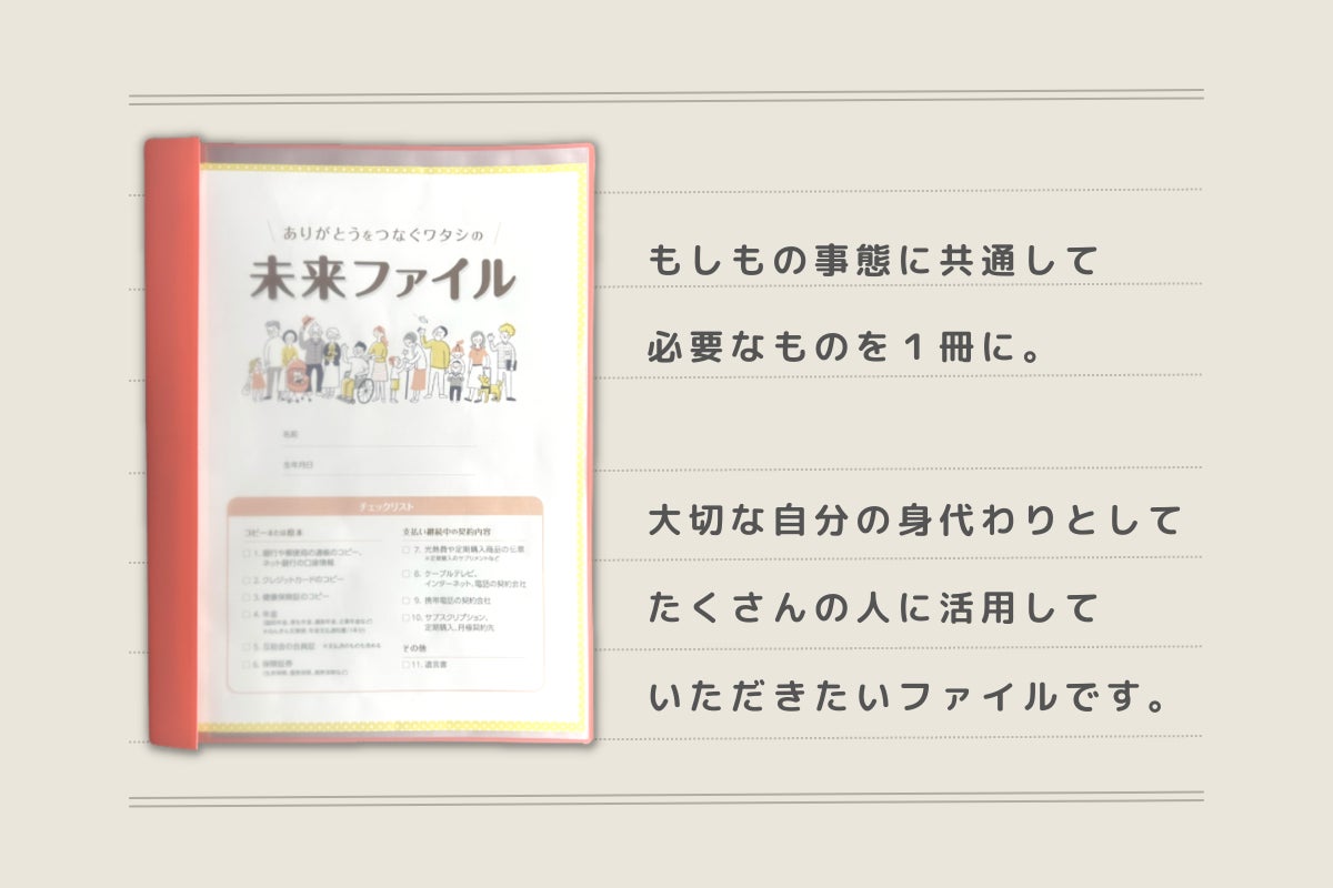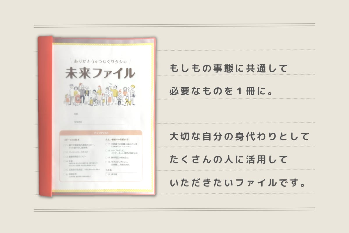あってほしくはないですが、もしものことは誰にでも起こりえます。未来に何があっても自分と家族が困らないために、この『ありがとうをつなぐワタシの未来ファイル』を広めたいと思っています。