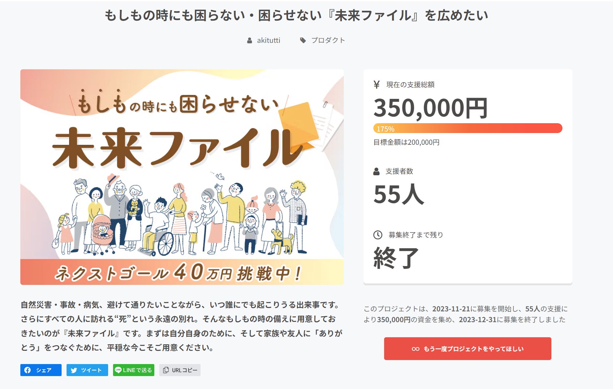 できれば家族の一人ひとりが1冊ずつ『ありがとうをつなぐワタシの未来ファイル』を用意してほしいと思っています。まずは一家に1冊の『ありがとうをつなぐワタシの未来ファイル』を、日本中のすべての家庭に備えていただきたいという思いでクラウドファンディングに挑戦することにしました。