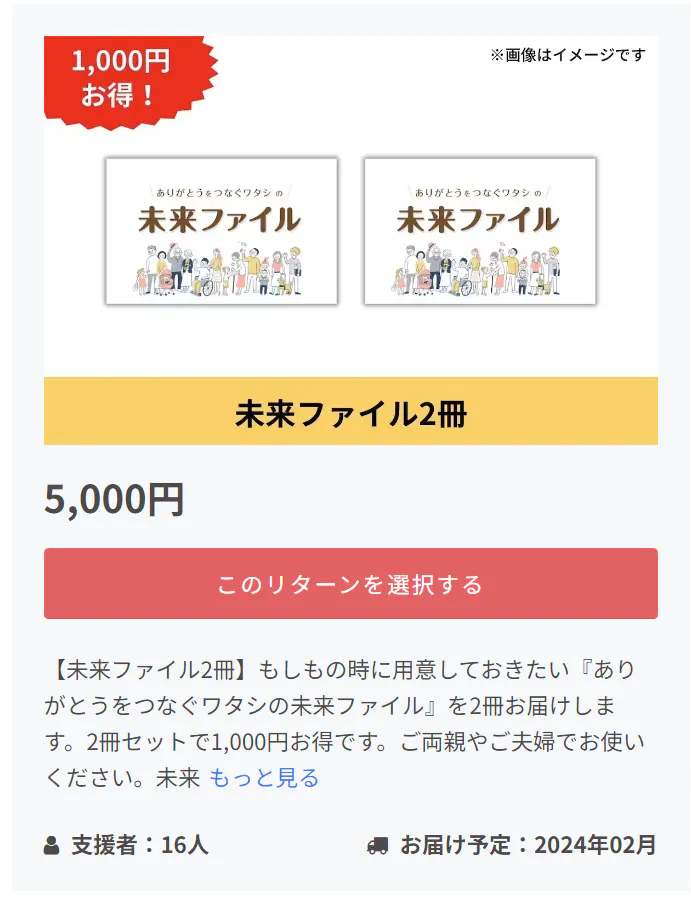 リターンには、『ありがとうをつなぐワタシの未来ファイル』に加えて、未来に備えるための講座などをセットにしたものをご用意しました。使い方をしっかり学びたい方、ひとりでは準備する自信がない方は、ぜひ備え方講座を受講していただけるとより理解していただけると思います。