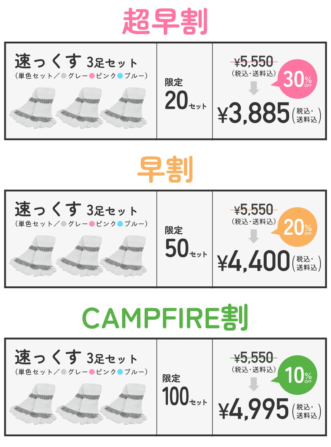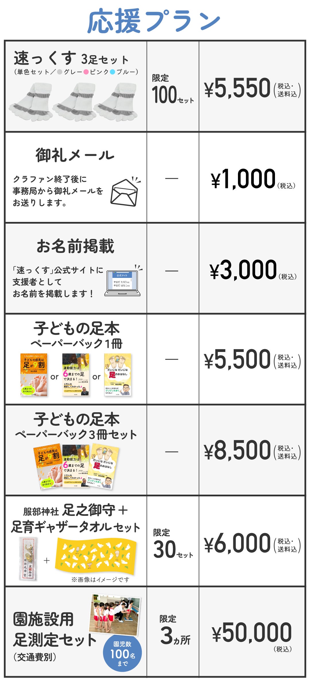 2023/12/30 16:24今年もあと1日を残すのみになりました。プロジェクトリーター Imaizumiです。ご家族と楽しいひと時をお過ごしのことと思います。12月6日(水曜日)にスタートしました「子どもの足を育てる靴下」予約製造も皆様のご支援のお陰で、目標の160%近くまで到達しました。温かいご支援に心より感謝申し上げます。今回幸運にもご支援により速っくすがお手元に届く方は、以下のお試しをやってみてください。①「速っくす」履く前の片足バランスVs履いたのちの片足バランス時間②「速っくす」履く前のケンパVs履いたのちのケンパのスムーズさ③「速っくす」履く前のスキップVs履いたのちのスキップのスムーズさ④「速っくす」履く前の立位体前屈Vs履いたのちの立位体前屈の床との距離⑤「速っくす」履く前のボール投げVs履いたのちのボール投げの距離その他、かけっこのスピードやボールキックの距離など変化を確認してみてください。きっと変化に気づかれると思います。子どもにとって動きの変化は、自尊心の向上にもつながり、自己肯定感を高める原動力になります。「子どもの足を育てる靴下」予約製造も今回のクラウドファンディングのみとなり今後の製造見込みはございません。予備の枚数やサイズUPの準備もこの機会をお忘れないようおねがいします。また、発送時に同封します各種特典なども楽しみにしてください。「子どもの足を育てる靴下」の予約製造受付も明日迄なのでお友達・ご親戚の方がたへのお声掛けもどうぞよろしくおねがいします。それでは、みなさま、どうぞ良いお年をお迎えください! もっと見る