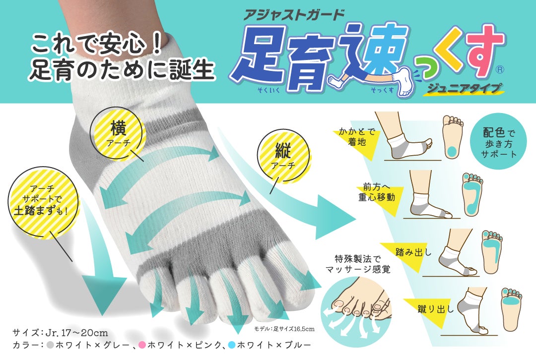 足育アジャストガード速っくすは、従来の靴下とは違い幼児の足の成長と健康を最優先に考え、幼児の発育発達に寄り添ったソックスです。