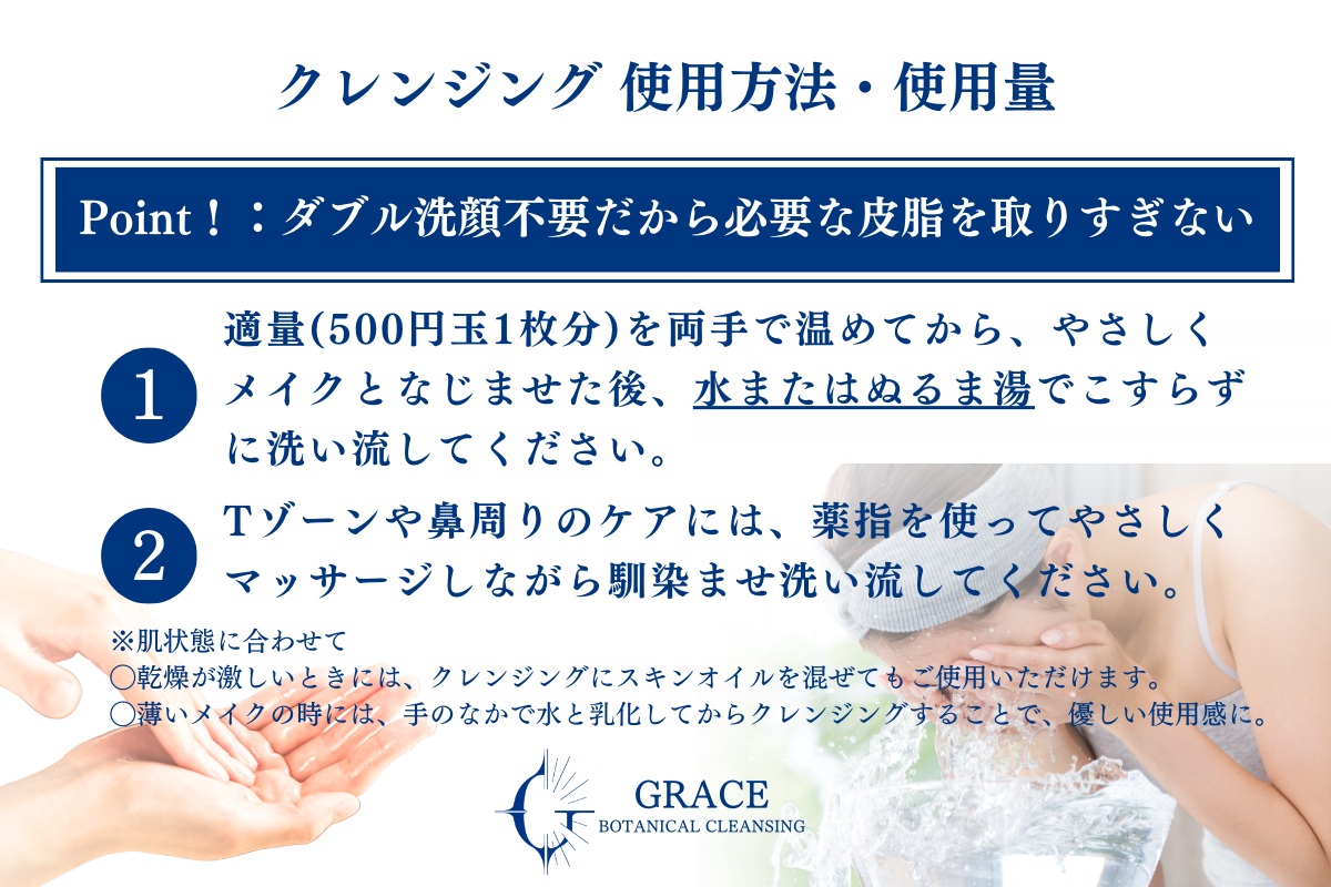 ※クレンジングのついでに、お顔のマッサージをしようと、ついつい力を入れすぎてしまったり、必要以上に長い時間お顔にのせておくことは全て刺激につながります。