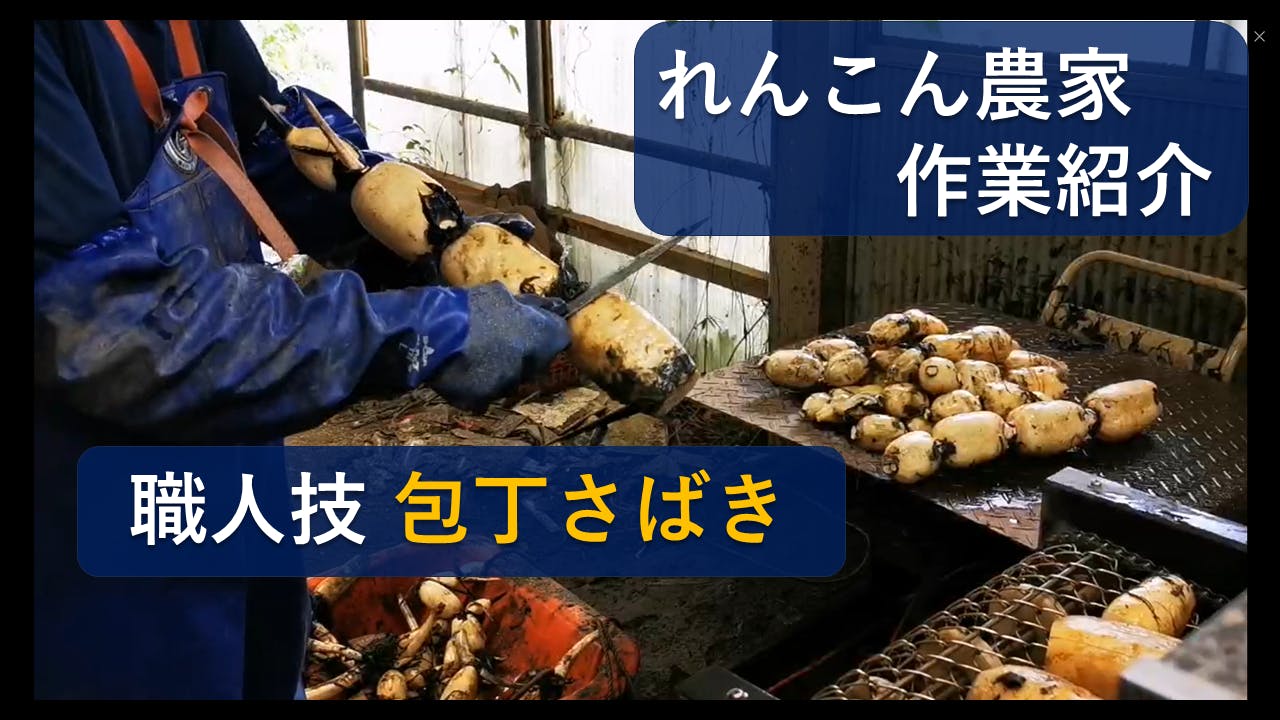 さて、クラファンをやるようになって、画像編集など前にも増して色々やるようになったのですが、今回ちょうど作業動画を撮影していただいてましたので、れんこんの作業の収穫後の根切り作業を紹介いたします。