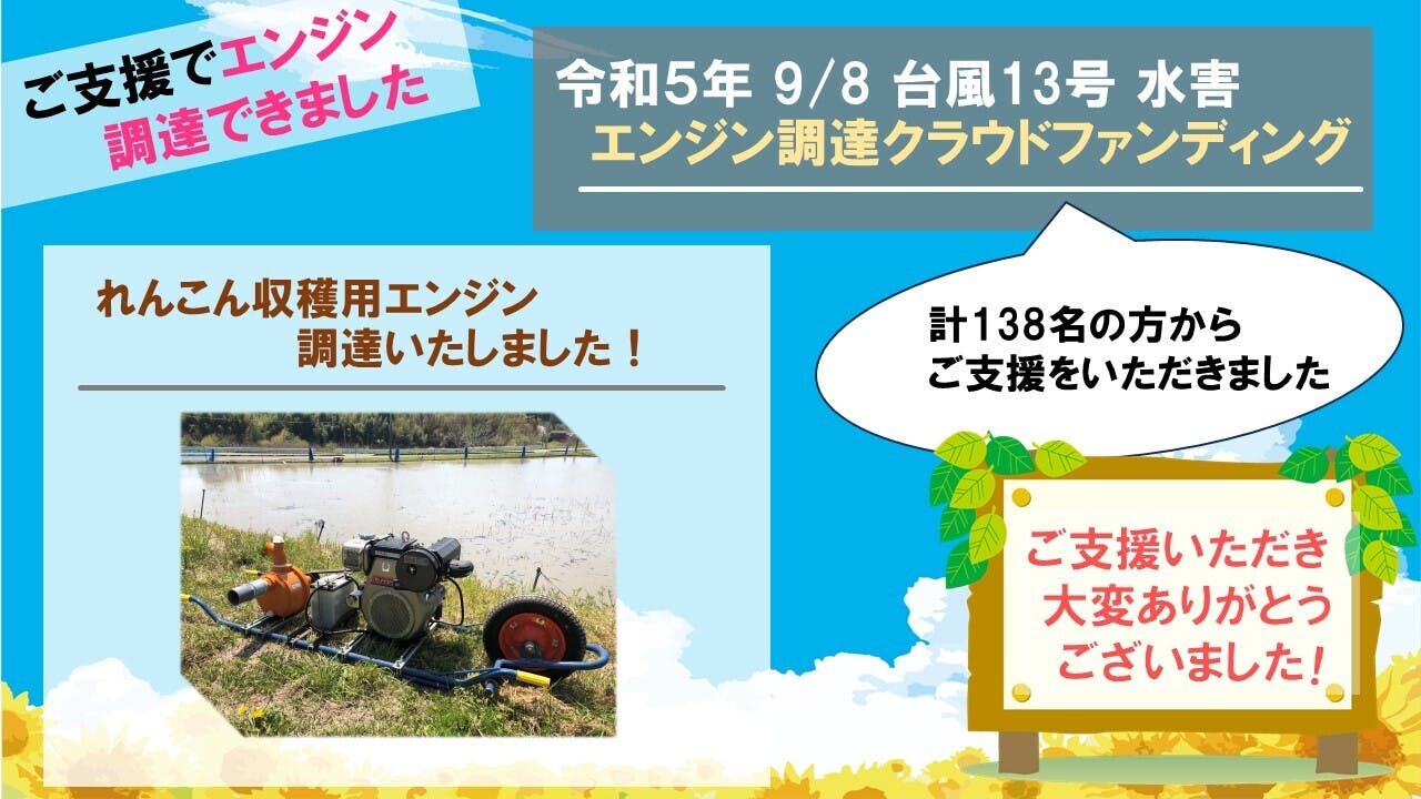 クラウドファンディングのご支援をいただき、無事 れんこん収穫用ディーゼルエンジンを調達ができました。