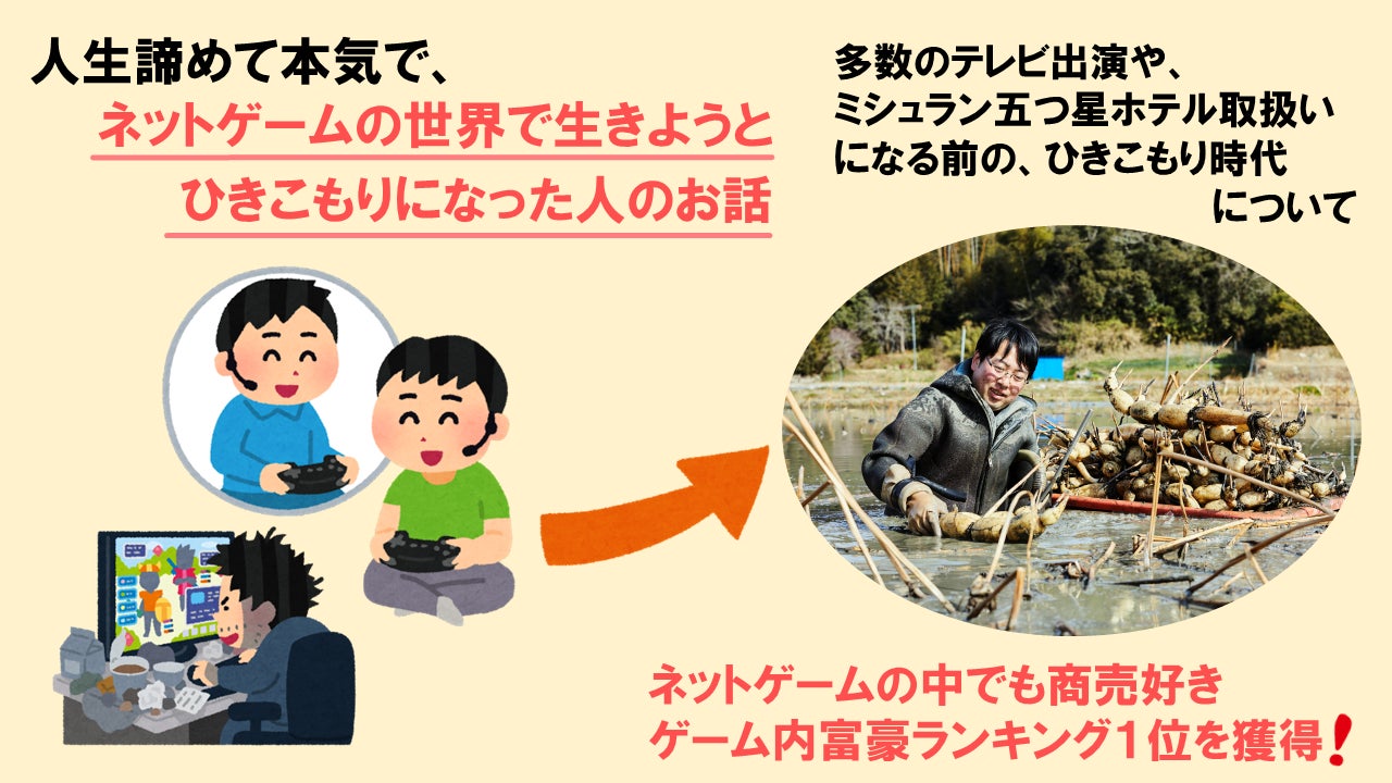 クラファン メイン記事本文についかしたいのですが、まだ間に合わないのでこちらに構成は・引きこもり時代の話・自身の引きこもり脱出の話・有名な父親の跡を継ぐという重さ・ゲーム内 富豪ランキングNo.1獲得について 元ネットゲーマーの引きこもりと経歴を言いますが、以外にガチの引きこもりだったと認識されないようで、色んな人と話すのが好きな、人生終わった、諦めた系の引きこもりでした。 引きこもりからの脱出というのは、当時の心境も覚えていますがとても難しく思います。 自分自身の場合、同じITに関する仕事やシステム管理者など同様の職業は選べないなと思っていましたし、もう一度社会で働くことができる自信なかったり。今は克服していますが、メールを見る事や電話に出るのが怖くなってしまった時期がありました。 都内で一人暮らしで、ネットゲームをしている時も、仕事から帰ってきたであろう時間帯にログインして、ネットゲーム仲間に対して仕事をしてる風を装ってみたり、このままではいけないなと思う事も数々ありましたが、再就職で空白期間何していましたか?と聞かれるのが想像されることで、それ以上考える事をやめていました。 今思うと、そのように重くなる前に手をうたないといけないのかもしれないし、そういう状況になった場合は尚更、小さな一歩、軽い一歩でないと、とても重くなった心は動かせないのかもしれません。ゲームでいう、最初はレベルの低いクエストからはじまり、自身が段々成長して、面白くなっていくような、そういう経過を経て脱出できるのかなと。 経験側として、本人側の気持ちも分かりますし、親側としてもどうしたら良いか分からず辛いものですよね。親に今のままではダメでしょ、仕事しなさいと言われても、どうしても本人は反発しますし、そのままでいけないのは本人も良く分かってる事でもありますし、心を癒す期間も必要だったりします。時間をかけてゆっくりきっかけの種を撒いていく必要もあるのかもしれませんね。 さて、私自身の引きこもりからの脱出の経緯は、れんこん業界で育種家として有名な父親が亡くなったことが、引きこもり脱出のトリガーでした。一度ひきこもり時代に都内の部屋に父親が来たことがありまして、扉のチェーン越しで部屋には入れなかったですが、れんこんを教えてやろうか?と言われましたが『結構です』と返したのを今でも覚えています。 ここで父親に教わっていたら、今の金坂蓮魂は無かったでしょう。『俺は他の人より理解力があるぞ』と昔、父親に言われた記憶がありますが、たぶん父親でも今の自分の栽培技術については理解は出来なかったでしょうし、短期間で直接販売の経営システムを構築もできなかったかと思います。 話は戻りまして、父親が亡くなってから父親の事をとても意識するようになりました。生前は親とはあまり話はしないので(男親とはあまり話をしないのが一般的かもしれません)、嫌いなのかなとか思っていましたし、高校以降は勉強するのも、もういいかと辞めてて、勉強する気もないので高校卒業しても2浪してました。 見かねた父親が新聞の専門学校の募集記事一覧を持ってきて『好きなとこ行くか家から出てけ』と言われ、そこで目に留まったのが情報処理専門学校のゲームプログラミングゼミでした。専門学校はプログラミング専攻で情報処理科なので、基礎的なIT関係の勉強は一通りやり、マイクロソフト系のソフトウェアの使い方は基本やりますが、現在のチラシや画像データのデザインは専門分野ではなかったので、就農してからやりながら学んでいった事になります。そんな経緯で就職してから就農までは今までの流れになります。自分の人生はホントにゲームに関する事で繋がってます(笑 そんな流れを経て茨城で40~50日研修して、実家に戻って就農しましたが、実際に農業をやってみるとハードな辛さがあります。1か月仕事して、3か月休んで、また1か月仕事して半年休んでと、なぜ仕事を自分は頑張れないのだろう?と泣いた時期もありました。 自分がどうしたら頑張れるのか?やりたい事であれば続けられるのでは?という事で始めたのが栽培技術研究で、今に行き着くという事になります。研修先の人には、『そんな事一人前になってからやるんだよ!』と言われ、一般的には当然なのですが、その当時の自分のモチベーション作りには必要だったのと、それがなかったら今は無かったですね。 話は戻り、父親が亡くなってから就農決めるのに2か月ほど悩みづづけました。それは、父親はれんこん業界で有名なので『その次男の息子が継いだよ』、『やっぱり辞めたんだって』と言われるだろうと。 就農したられんこんを辞め親の顔に泥を塗る事は出来ないし、普通のれんこん農家で終わりたくないし、やっぱりあの父親の息子なんだと評価されたい。今はもう叶う事は無いですが、父親に認められたい。そんな気持ちがありました。
