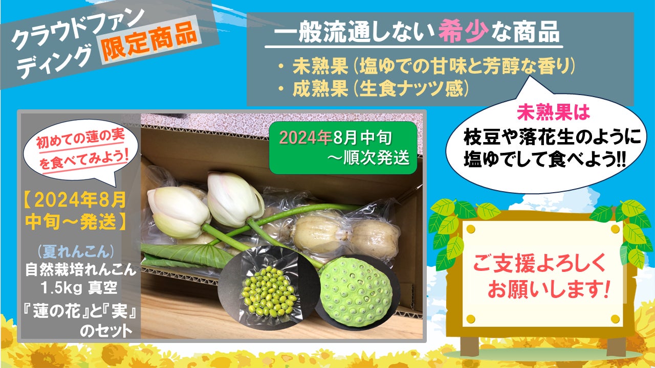 落花生や枝豆のように茹でて食べる!? 一般流通がほぼ無い蓮の実と自宅で蓮の花の開花を近くで見たい! お楽しみセットこの商品は、夏れんこん1.5kg、蓮の花2本、巻き葉1枚、蓮の実(未熟果と成熟果)が同封されます。 ※花托は成熟果を予定してますが、箱の スペースの関係で取り出した実の真空パックになる可能性もございます。 【蓮の花について】また、蓮の花は到着後、花瓶などに生けまして、涼しい所に飾られますと翌朝開花いたします。 数日で散り僅かな期間ですが、お楽しみいただければ嬉しいです。※開花しない場合もございますので、その点ご了承ください。 【蓮の実について】国産の生の蓮の実は、都内の飲食店でも手に入らないと聞きます。また、オーガニックの蓮の実はさらにありません。中国産の乾燥実が飲食流通に流れてます。=======================未熟果:塩ゆでの甘味と芳醇な香り 皮付きのまま茹でて食べます。=======================成熟果:生食ナッツ感 外の緑の皮を剥いて、中心の芽が苦味の元なので、 それを取り除いて周りの白い実を食べます。=======================