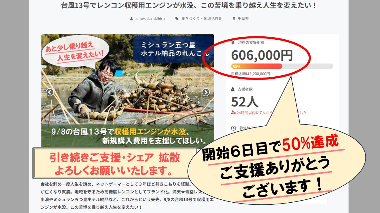 金坂蓮魂 代表の金坂哲宏(あきひろ)です。この度は、たくさんのご支援をいただき、ありがとうございます! まだ、お礼の返信などが遅れておりますが、通常の業務をしながらクラウドファンディングを同時進行しておりますため、遅れる事ご容赦ください。よろしくお願いいたします。 タイトルの写真と今回のプロジェクトの通り、レンコン収穫用エンジンが水没し、辛うじて1台が残ったため、業務を継続する事ができておりますが、故障に備えて2台体制である必要があるため、今回クラウドファンディングを実施いたしました。 少し地域の事をお話いたしますと、中山間地域の小さなレンコン産地で、弱小産地でどのように生き残るか、そこで考えたのがブランド化の取組みでした。 また、高齢化により地域の景観維持も急激に難しくなってきたため、今年は急ぎ規模拡大や売り上げの拡大による雇用の確保を今後考えないとと思っていた矢先の台風被害でした。 そのため、打開するにはクラウドファンディングをするしかなかったのが実情です。、9/7 ~ 11/30まで、ミシュラン五つ星ホテルのディナーに農場名が入っていて、9/8は前日の7日から開始したところでした。緊急時の対応を速度を求めてやらないといけないのでこのあたりはとても大変でした。また、エンジン2台とも喪失を覚悟してたため、数か月出荷ができないこともありうる状況でした。たまたま、知り合いにクラウドファンディング実施者がいて、CAMPFIRE公式パートナーの方に繋げていただける事になりましたが、資金が無いため急ぎサイトを作り始めました。農業青年クラブの4Hクラブで、色んな広報物を作っていた事もあり、また自分で作成する事で農業者自身の言葉で・デザインで作る事でより早く・濃い内容をお伝えできると前から考えて作っていました。このスピードで出来るとは思ってなかったのですが、今までの資料作成の経験や、色んな人の支援もあってこのスピードで進めて来られました。この度ご支援いただき大変ありがとうございます><まだまだ、プロジェクト達成には時間がかかるかと思います。引き続き、ご支援・シェア拡散にご協力よろしくお願いいたします!