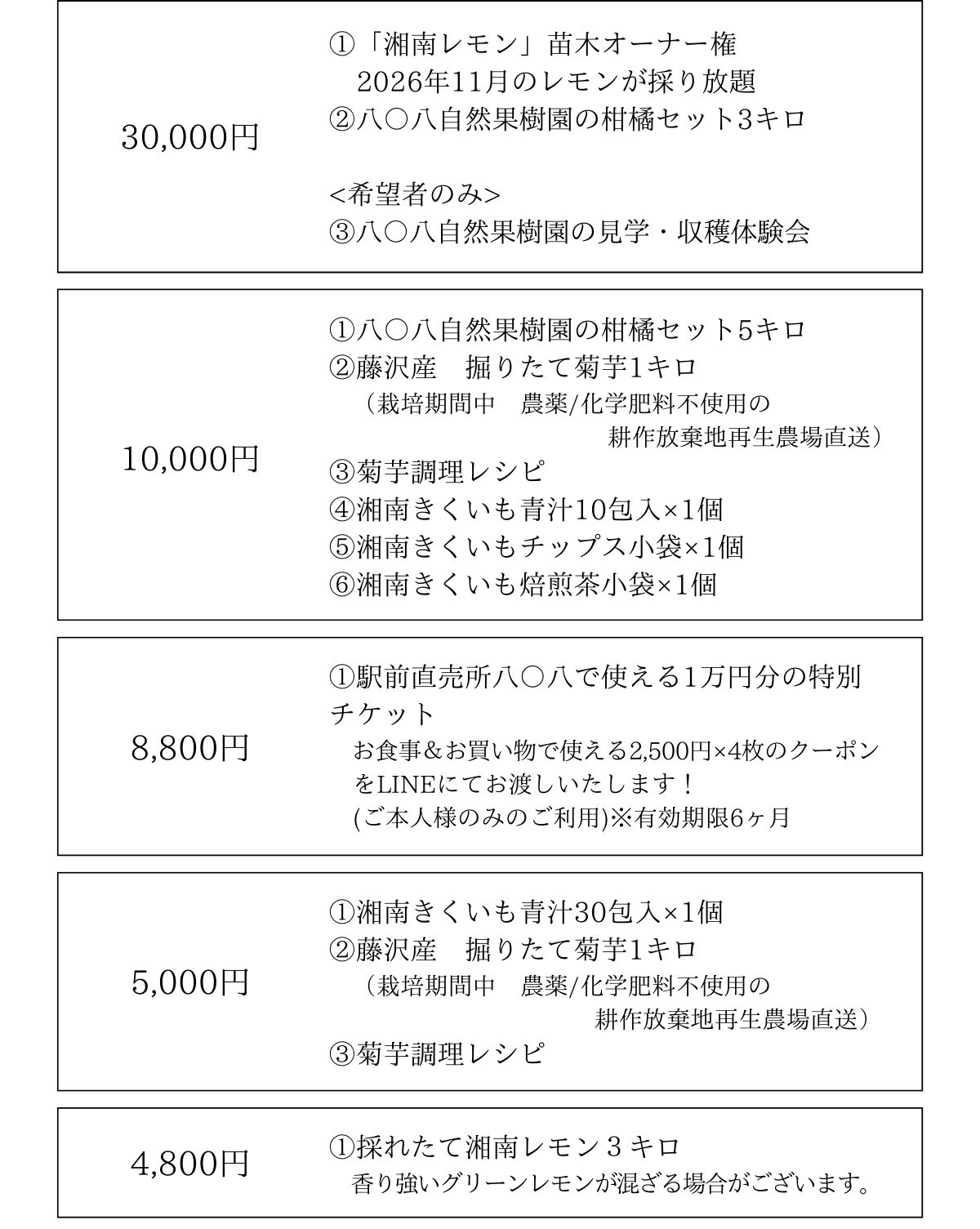 湘南レモンプロジェクトでは、現在八〇八が作る湘南銘品セットと、皆様と共に未来の湘南銘品を創り出すレモンをセットにしてお届けいたします。