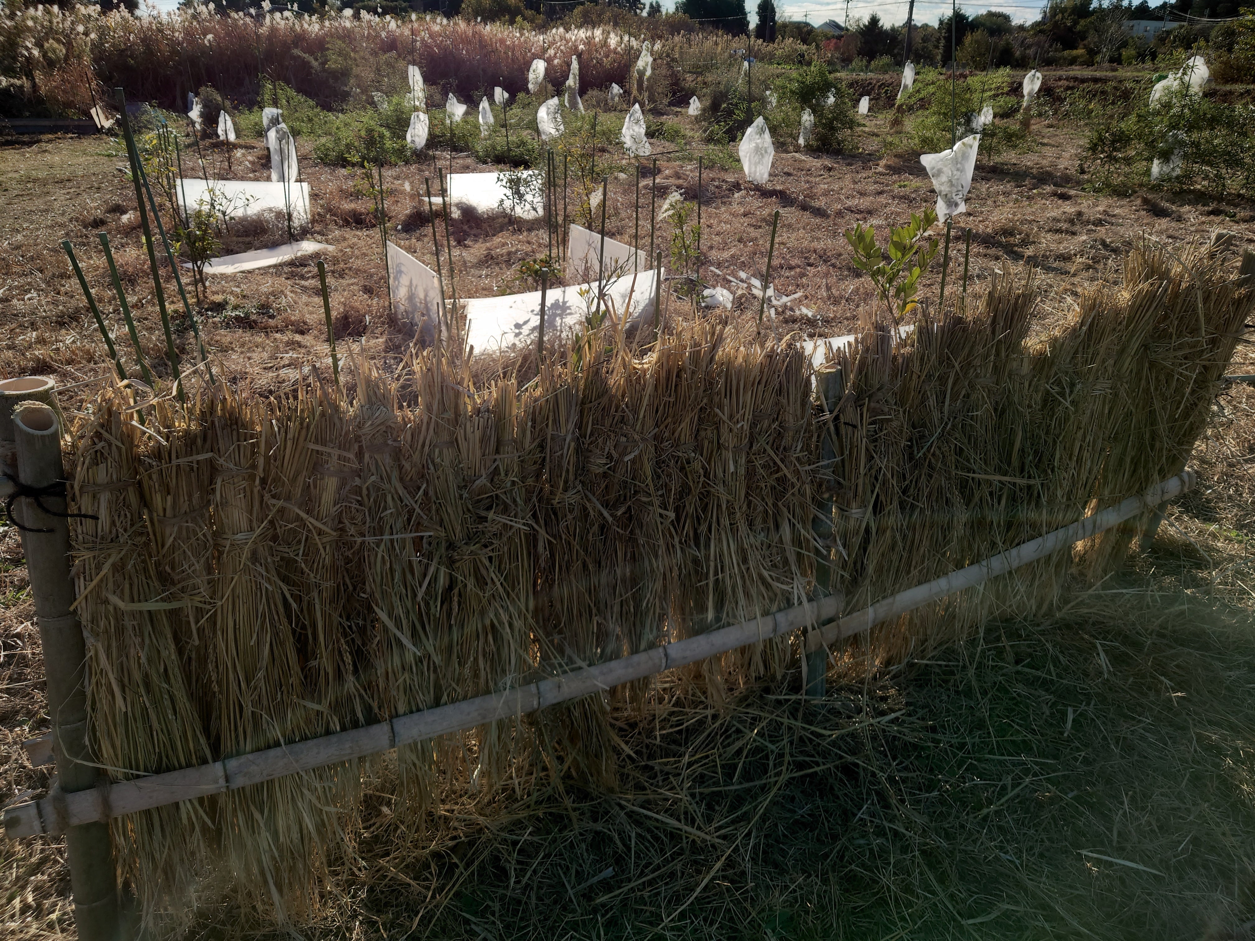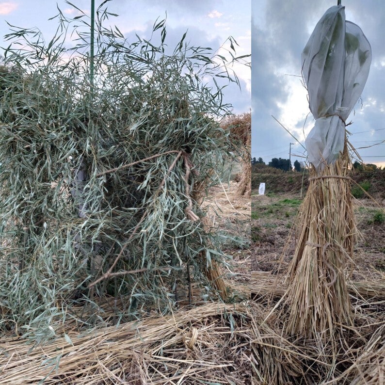 初めての冬を迎える湘南レモンたち。今年の冬の寒さは予想がつかないので、冬対策してみました。2月に雪は降らないと思いますが、雪国の樹木を守る、わらを巻いてみたり、不織布やビニールのトンネルが出来る前の時代、野菜を守る竹を差して垣根にしたり、不織布を巻いてみたり、色々な冬支度を進めています。