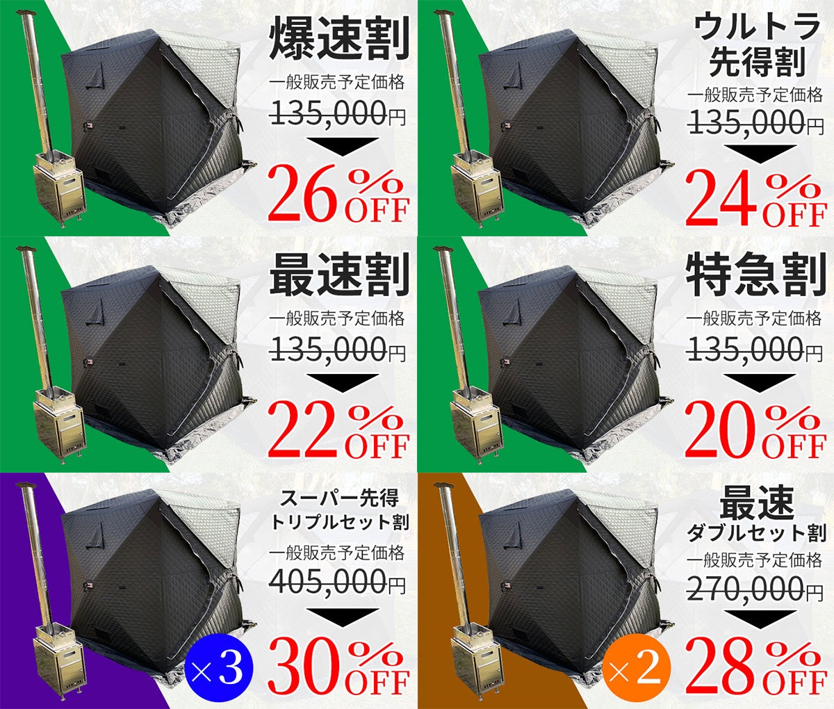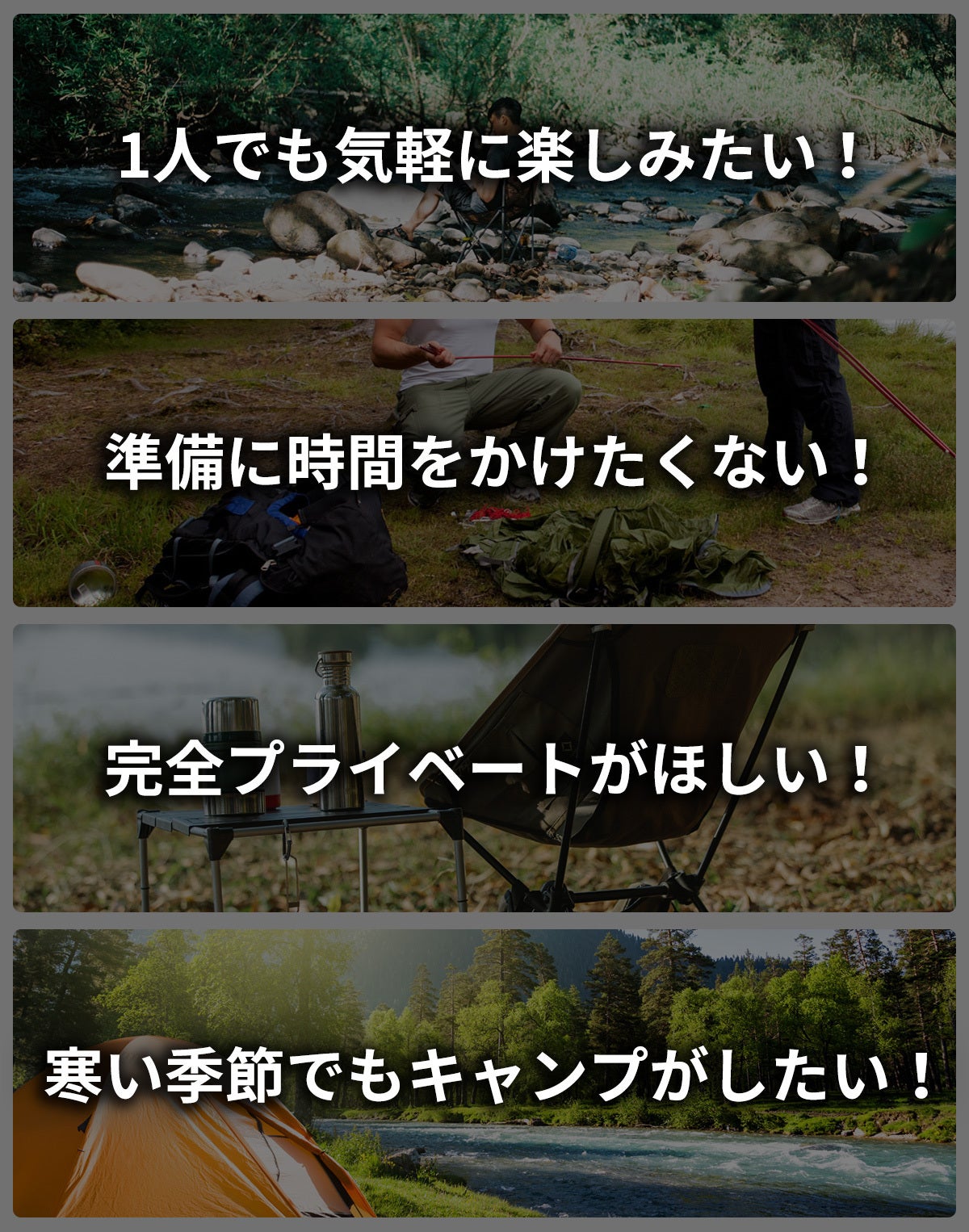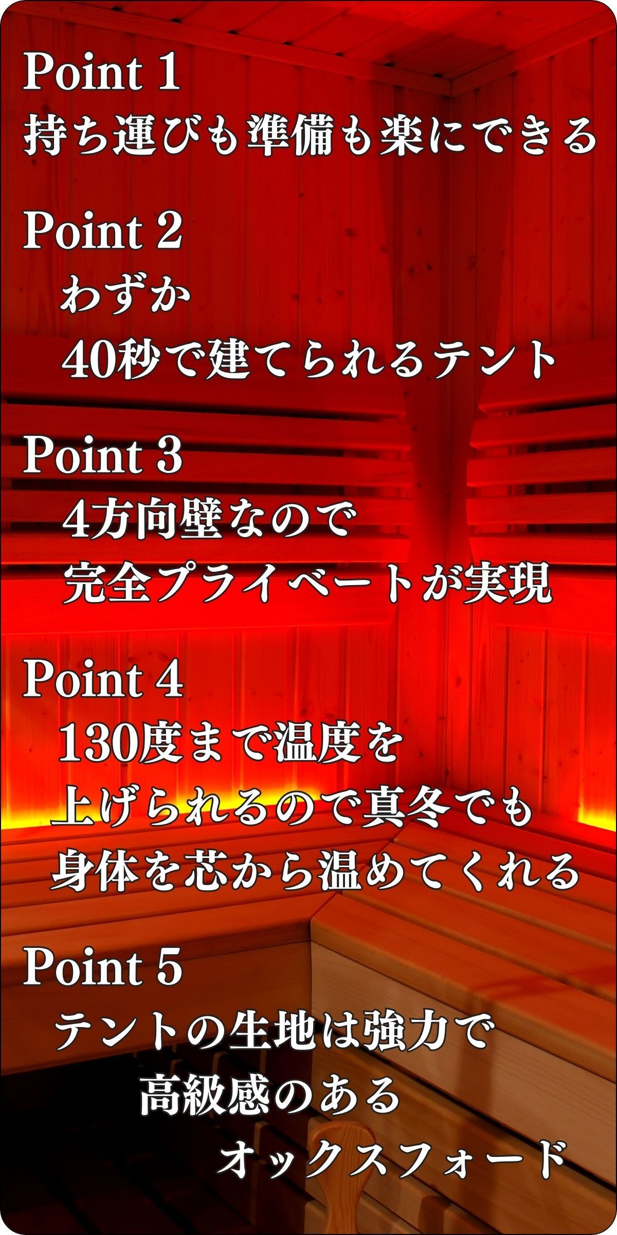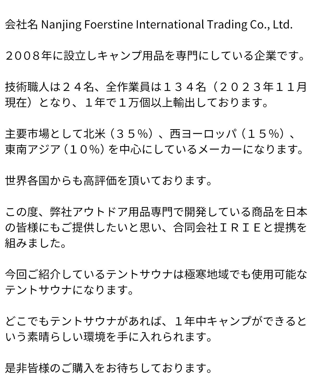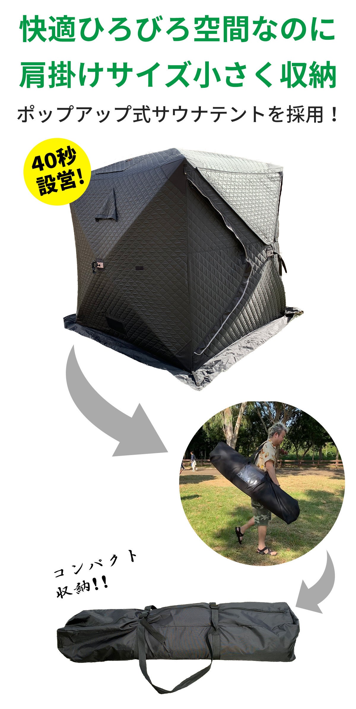・テントサウナ使用時は必ず水分補給をし、脱水症状や熱中症にならないように気をつけてください。
