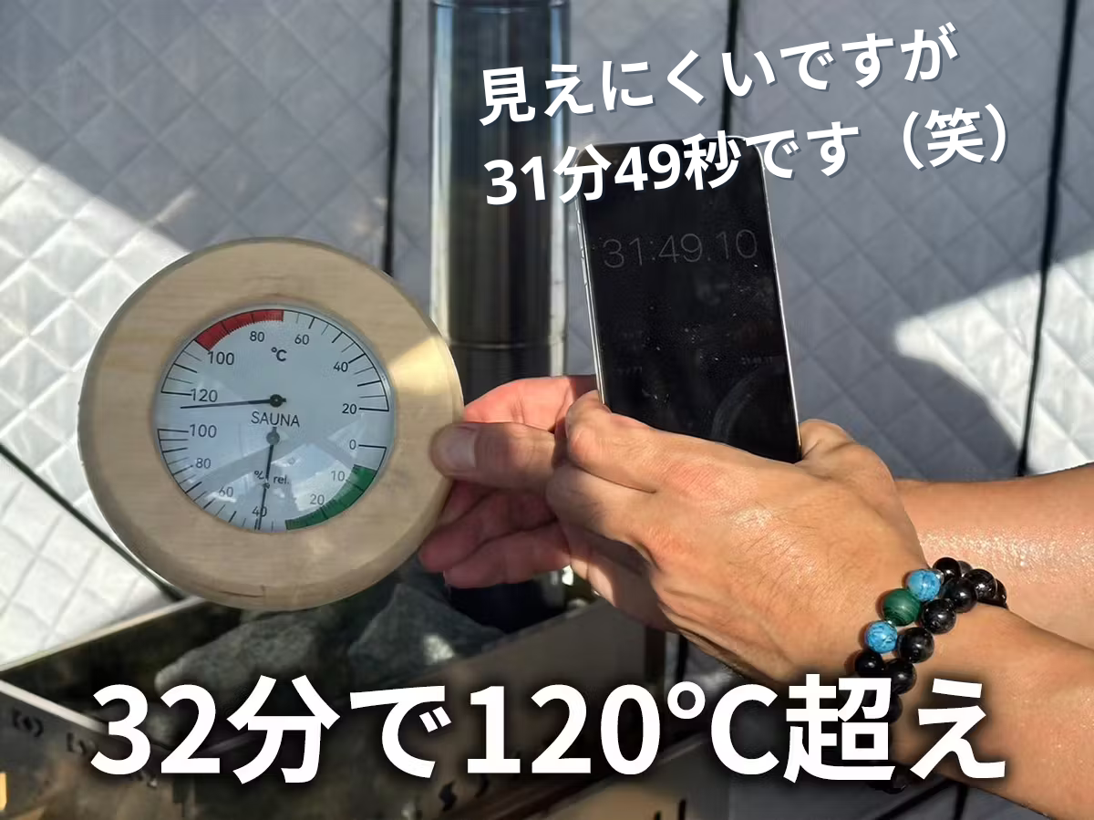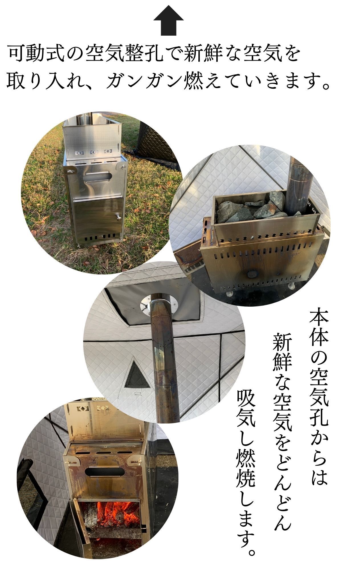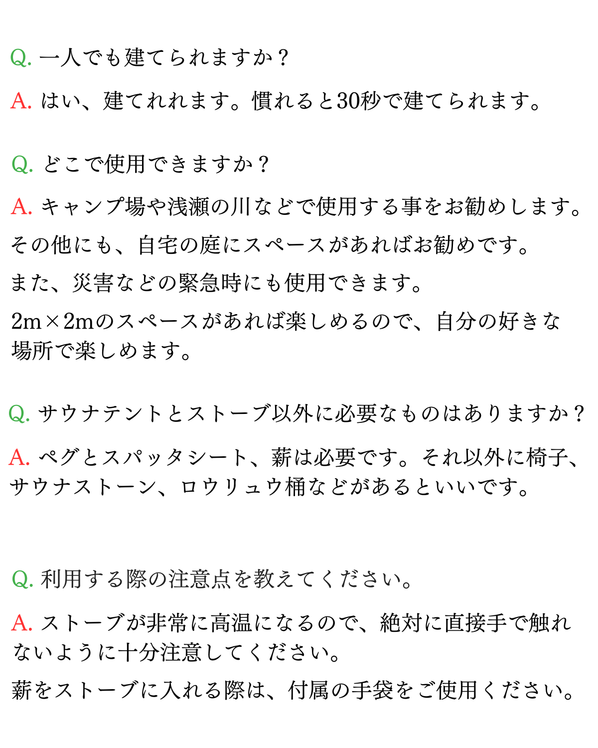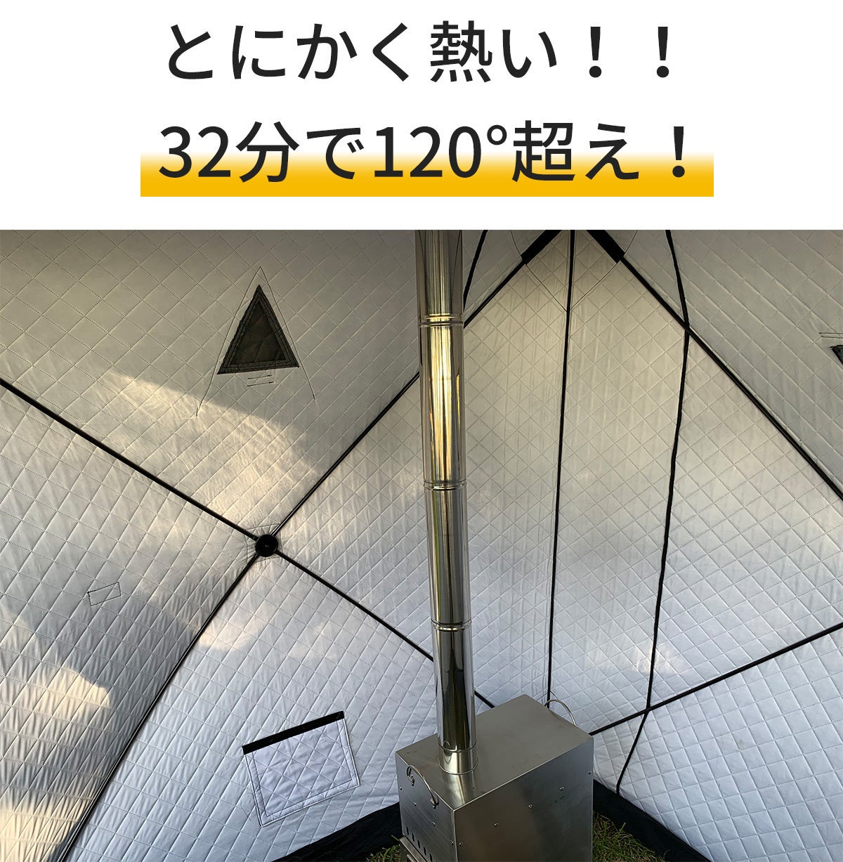 ・テント内は130℃まで高温になる場合があります。一般的なサウナは80~90℃です。温度計をご使用いただき高温になりすぎないように注意してください。