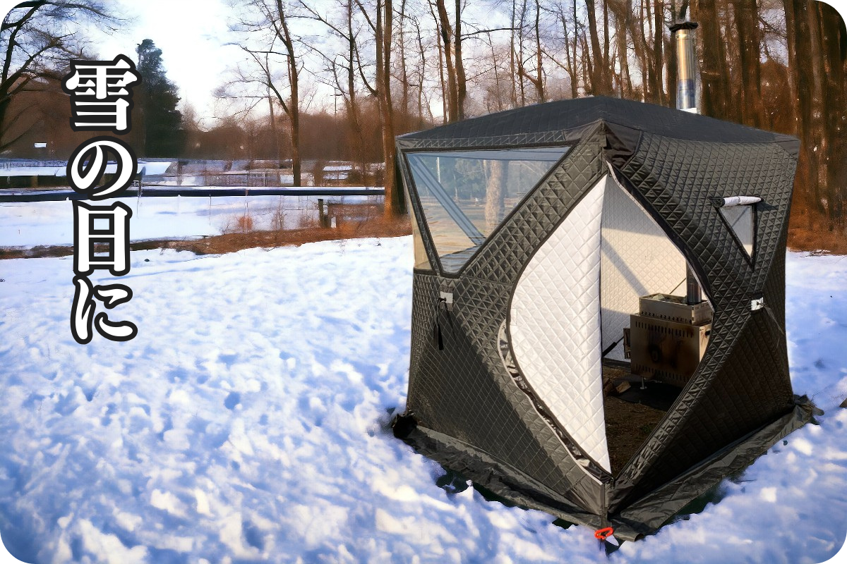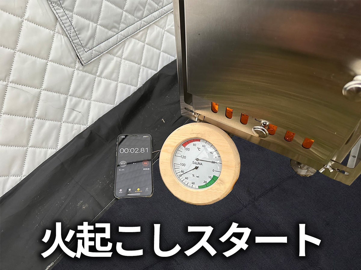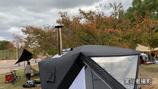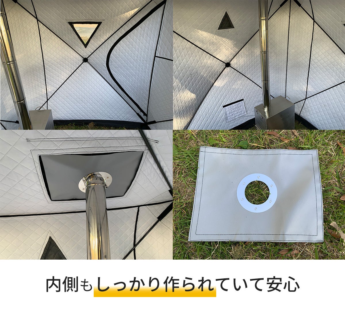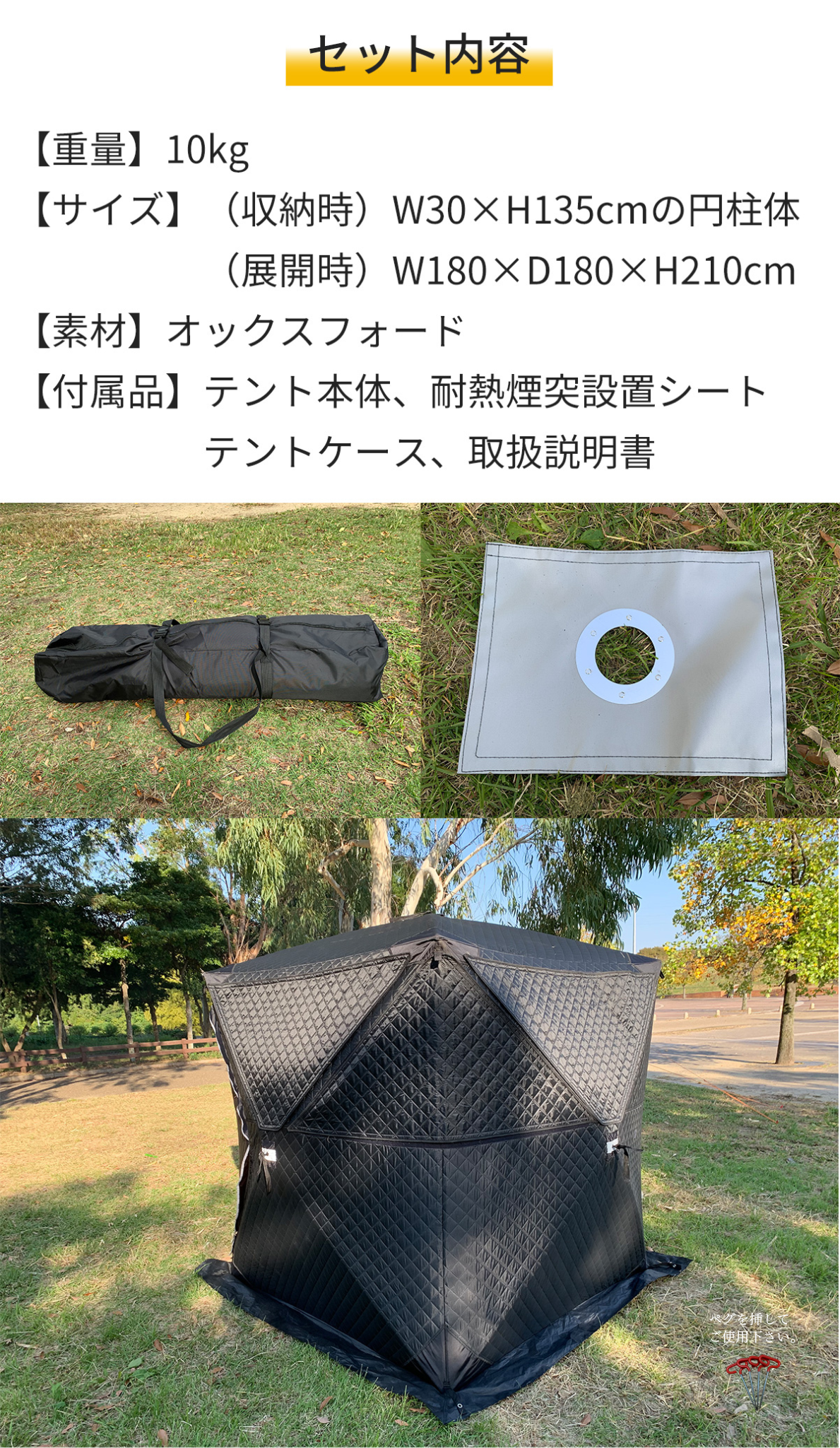 ・テント内は130℃まで高温になる場合があります。一般的なサウナは80~90℃です。温度計をご使用いただき高温になりすぎないように注意してください。
