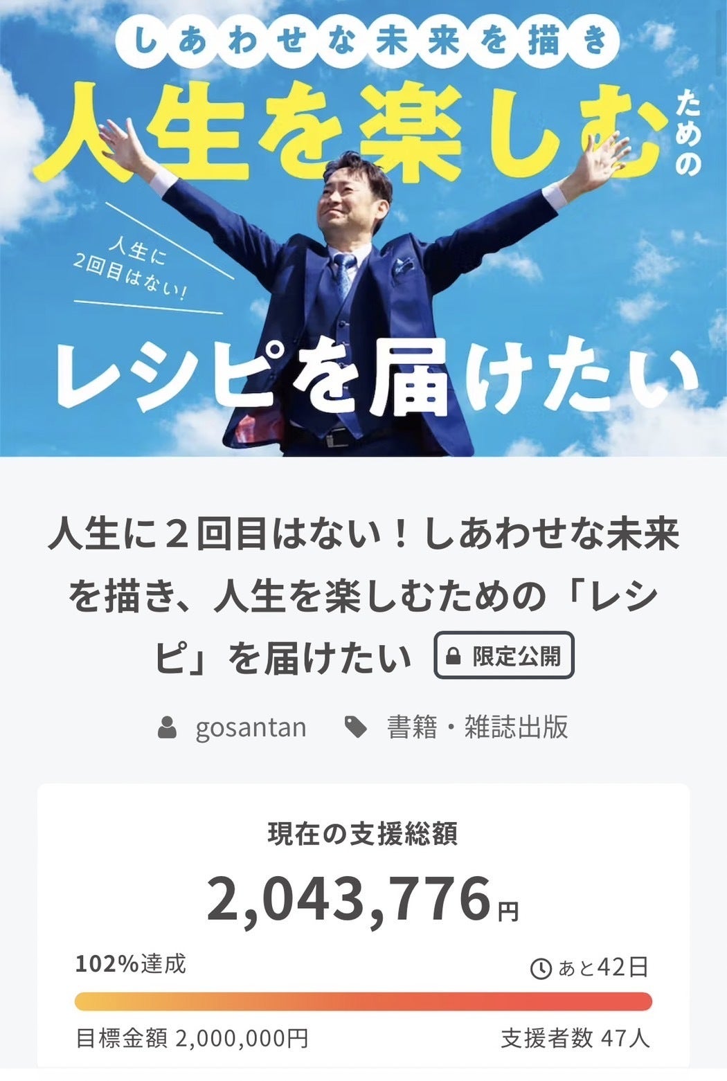 2023/10/24 19:24皆様のおかげで、2日で目標金額200万円を達成することができました!応援・ご支援いただいた方へ感謝の思いで胸がいっぱいです。本当にありがとうございます。ご支援いただいた資金は大切に使わせていただきます。さらに多くの人に人生を楽しむためのレシピを届けるべく、ネクストゴール支援者108人にチャレンジいたします!人生は一度きり。だからこそ、後悔しない人生を送る人を増やしたい。そんな思いで挑戦します。応援を宜しくお願い致します^ ^ もっと見る