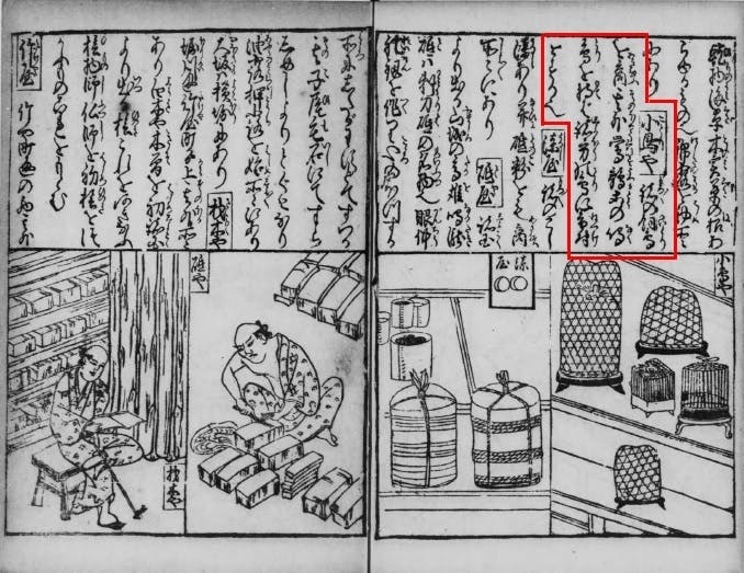 「小鳥や 諸の飼鳥を商。其外鶯、鶉等の鳴鳥を持ば、諸方の鳥に音付けをする也」