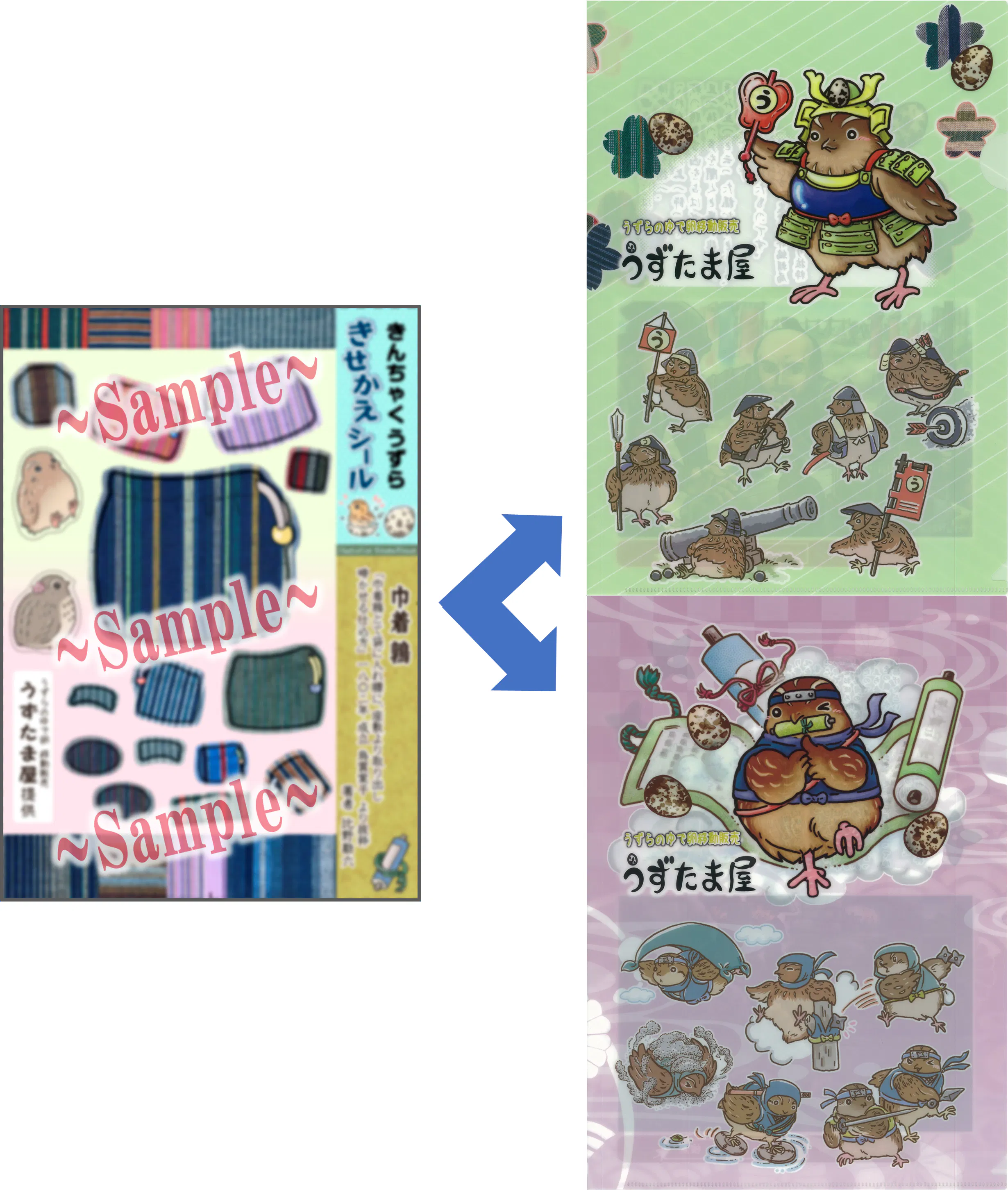 1,500円 A4サイズクリアファイル(220mm×310mm)「うずたま屋」「武将うずら」「忍者うずら」「巾着鶉着せ替えシール」 各1部