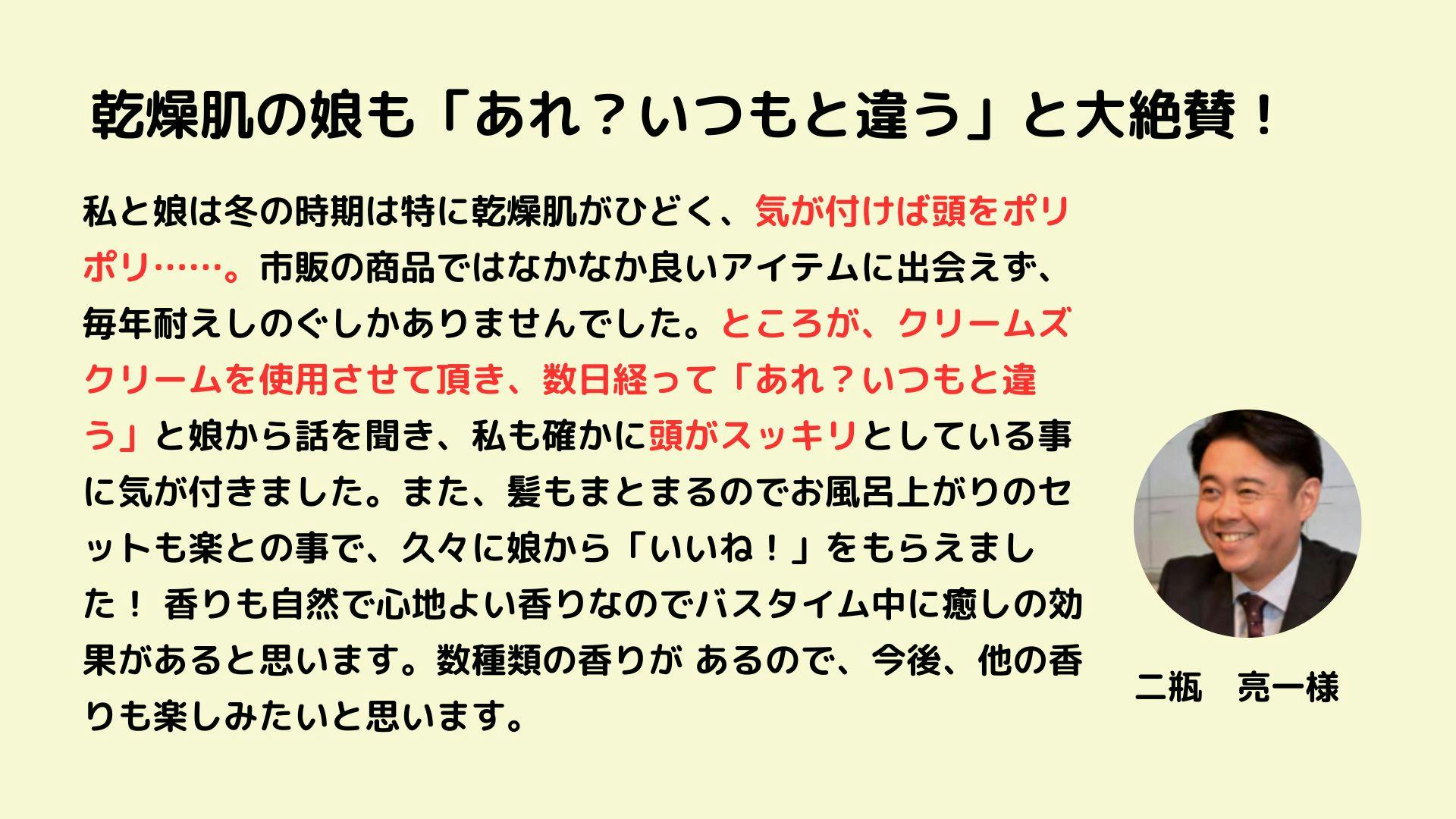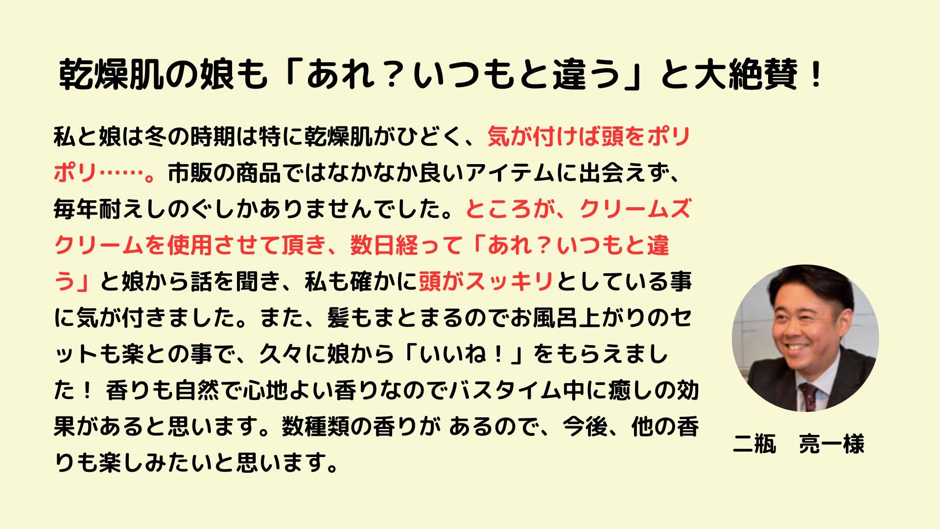 上記でご紹介したクリームズクリームと私が出演するポッドキャストへの出演権がセットになったリターンです。頭皮や髪になるべく負担をかけずに、汚れを落としてくれるため、若々しい健やかな印象を目指す方にはぴったりのアイテムです!ぜひ、一度手に取ってみてください!
