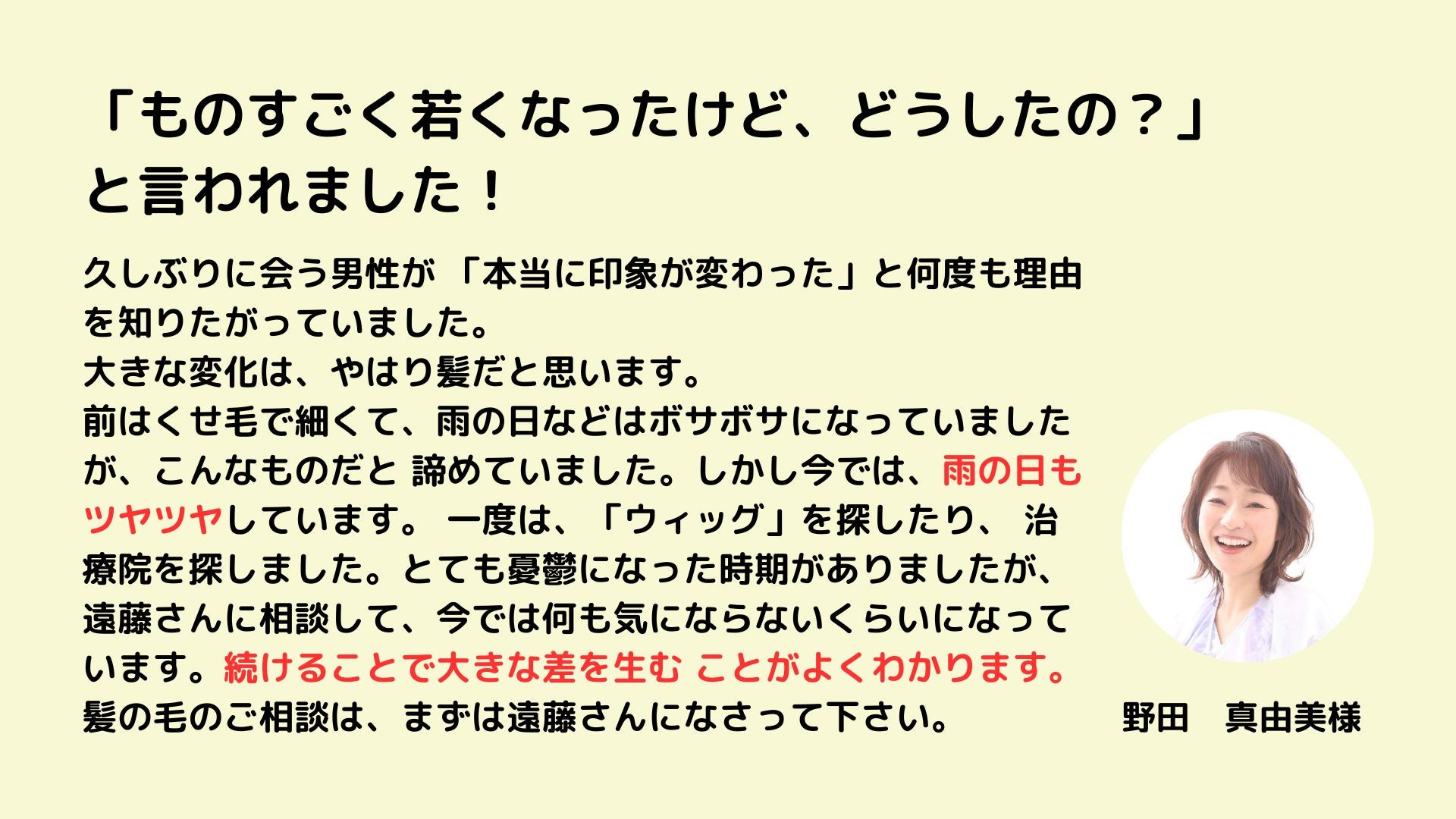年齢を重ねても自分を楽しむことを諦めず、キラキラと希望をもって輝く人生を送る方を増やしたい。特に髪の悩みによって周囲からの印象が大きく変わるのは男性であることから、イケメン・イケオジを目指す男性を応援したい。これが私の想いです。