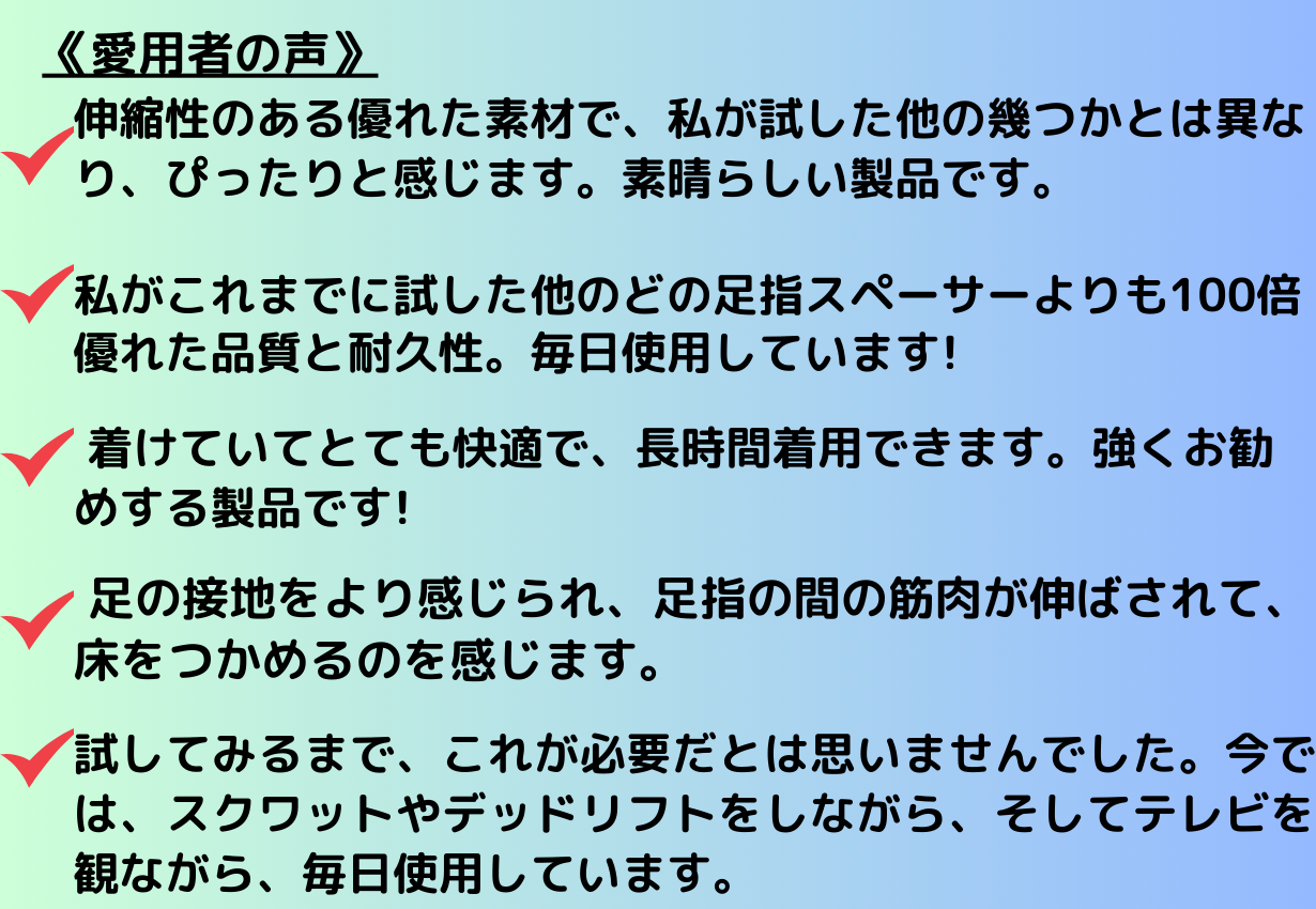 ●何年も使用していた足指スペーサーよりもはるかに優れています。ToeSpacerの大きなメリットは、上下が薄く平らで、足指と地面の間に厄介なスペースがないことです。