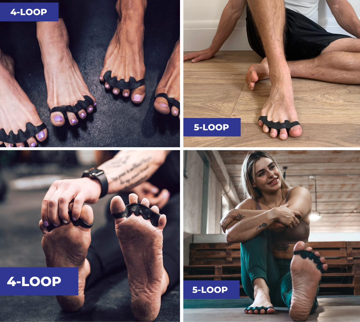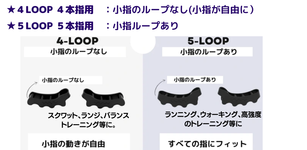 ToeSpacerは、4LOOPと5LOOPの2種類があります。4LOOPは、小指が自由になるよう、小指のループなし、5LOOPは、小指ループありの設計です。下記に適したトレーニングを表示していますが、あとは、御自身のお好みでお選び下さい。