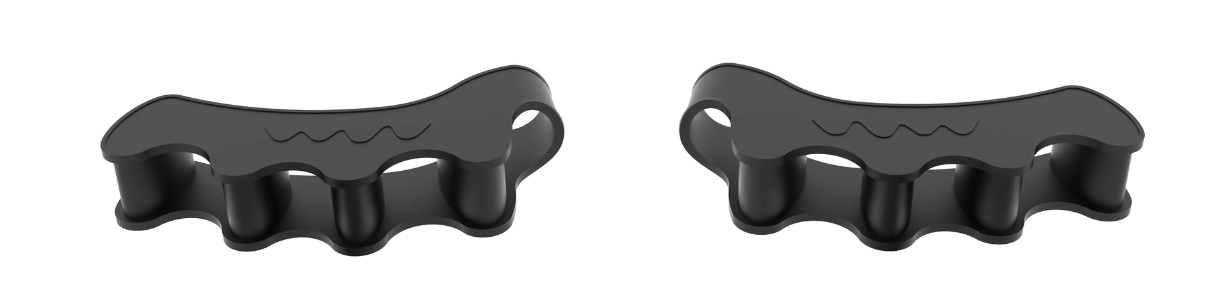 A:Toe Spacer はリバーシブルなので、左右どちらにも装着できます。親指を広い幅に入れて、なだらかな面を足先方向に、LOOP(個々のカーブ)のある面が足首に向くようにします。違和感がある場合は、裏返しにして、なだらかな面を足首に向けて装着してください。