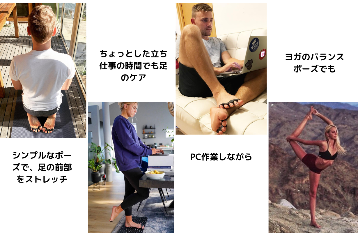 フットケア、ヨガやピラティスの際にも。足のストレッチやトレーニングに役立ち、足の健康をより一層サポート。トレーニング時では、常にToe Spacerと共に。。