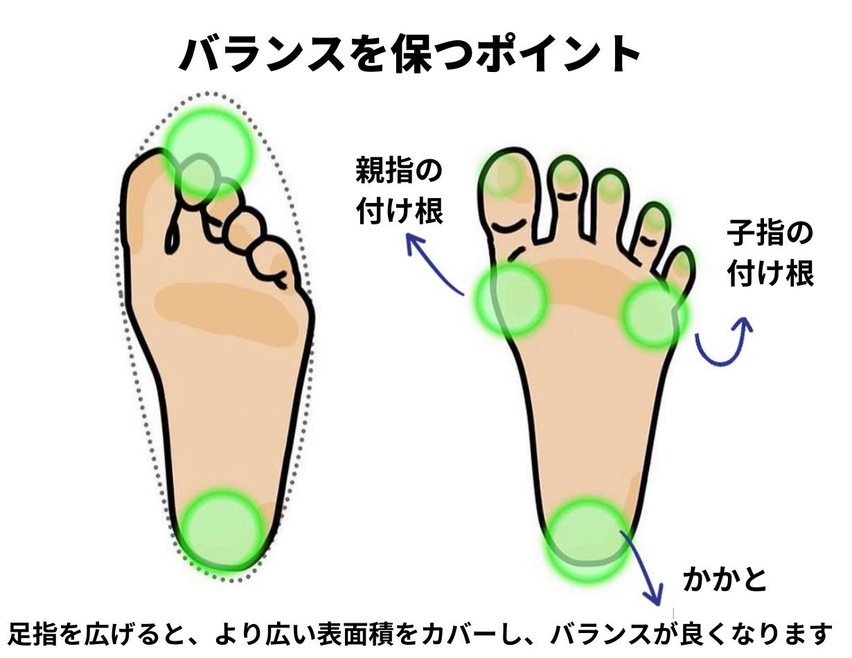 足指を広げると、より広い表面積をカバー。3点(踵、小指の付根、足の親指の付根)に体重を均等に分散することで、バランスが保たれ、姿勢が正しくなり、安定性が向上。この3点を結ぶラインでアーチが形成され、アーチ常に正常に機能することが大切。アーチが崩れるのは、基本、足指が使えていないことが原因です。