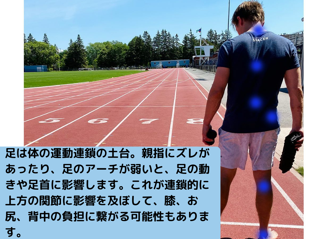 足指の位置と足の強さは、膝、腰、背中に影響を与え、足指のズレは、歩行、バランス、安定性、パフォーマンスに影響します。足指がずれていると、踏み出す時に100%の推進力が得られず、脚、膝、背中や股関節に影響を及ぼします。