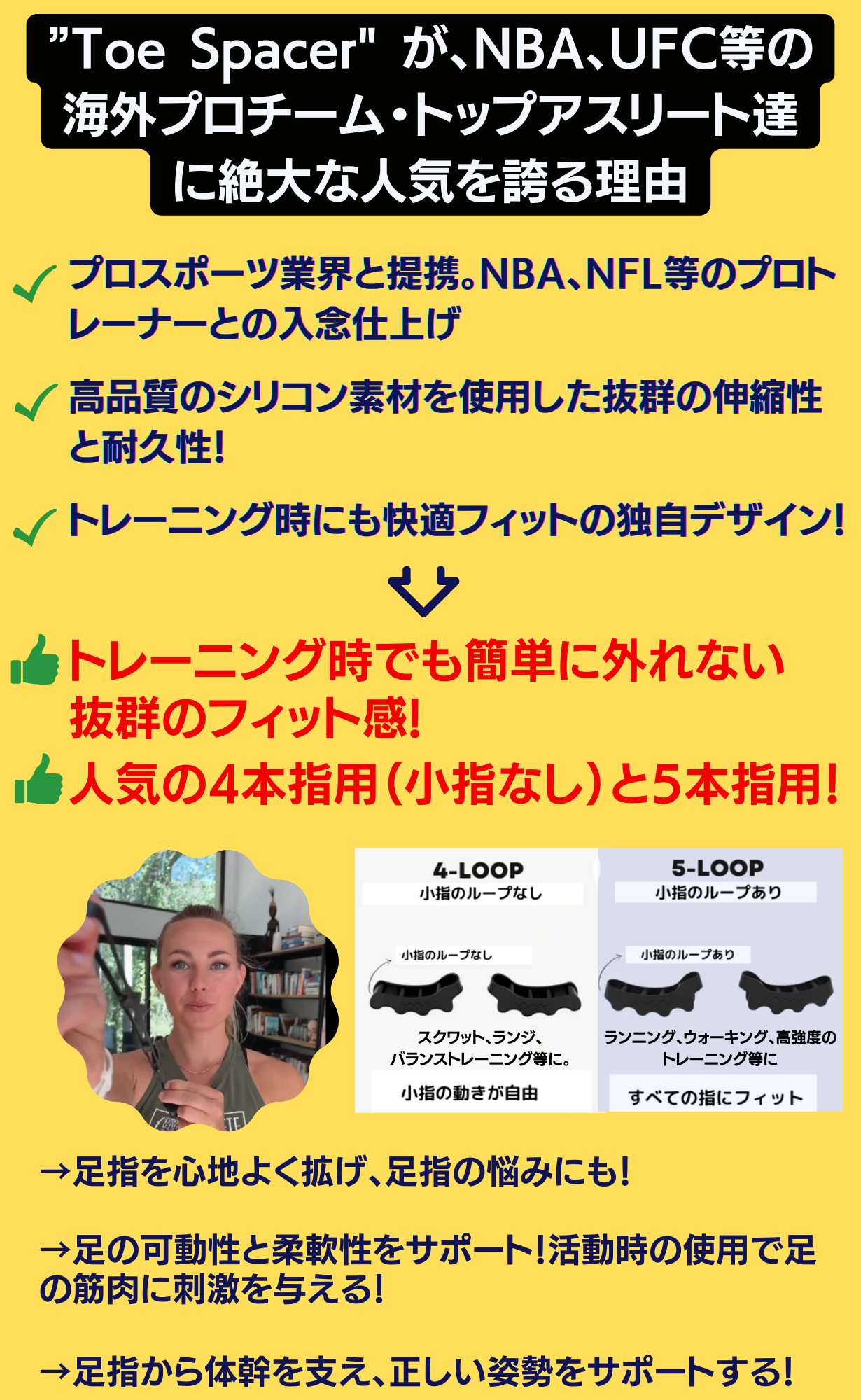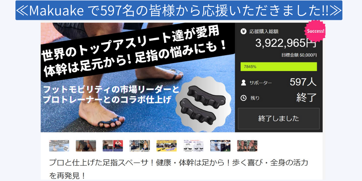 フットモビリティの分野で、マーケットリーダーである、TheToeSpacerが開発した、この足指のスペーサーは、世界中の数多くのアスリート達の間で愛用、賞賛されています。このToeSpacerを皆様にぜひご紹介したくプロジェクトを開始させました。アスリートの方だけでなく、足指の悩みをお持ちの方、スポーツされる方、姿勢を正しくしたい方、体幹を鍛えたい方、すべての方々にご利用いただきたい商品です。フィットネスやヘルスケアにおいて、足指にはなかなか注意を向けられないことも多いですが、ぜひ、皆様、ToeSpacerにご関心をもっていただければ幸いです。