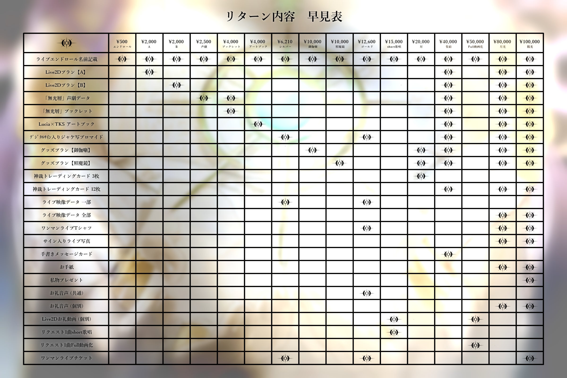 どのプランに何が入っているのか、どこに特典が追加されるのかが分からなくならないように、それぞれのリターン内容をまとめましたのでご確認下さい。