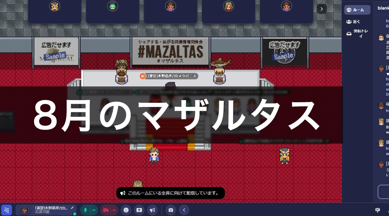 クローズドな情報ですが、8月9、25、27の14:00〜17:00にも開催するようですので、もしも日程が合わなかった方は8月のマザルタスに参加して能浦さんに直接お話して申し込みしてください!