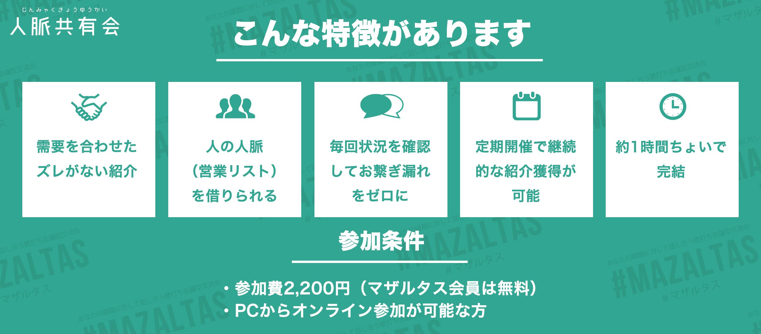 参加者の人脈(営業リスト)を共有し、一方的な営業にならないようお互いの需要と供給を確認できた場合のみその場で紹介先へ連絡まで完了する「ズレてない」紹介のみ出し合う会です。