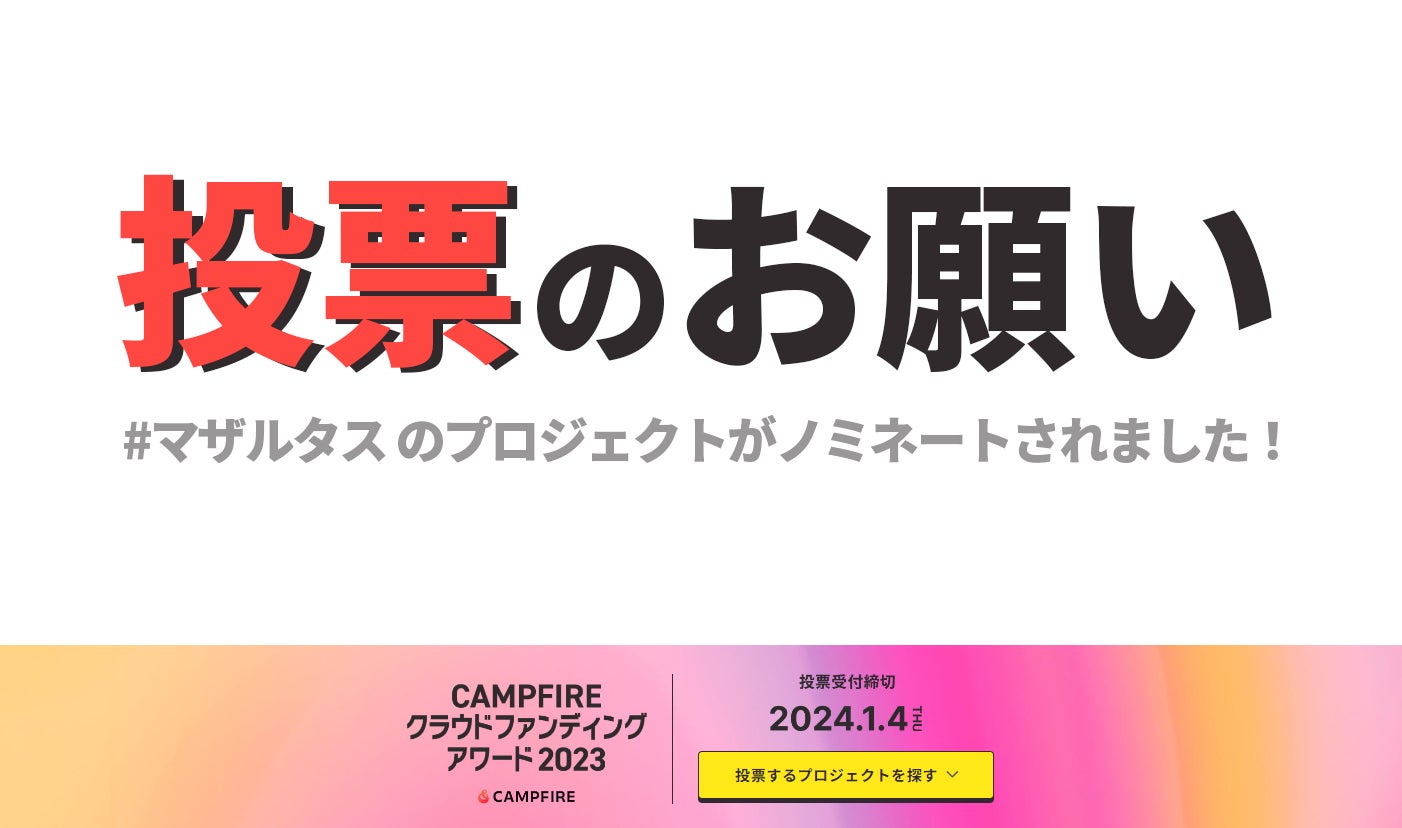 【追記】支援者がページを開いたら自動で最上部に出るようです!そこから投票してもらえます!━━━━✄━━━━ なんの間違いかCAMPFIREクラウドファンディングアワード2023に僕のプロジェクトがノミネートされました!!投票受付期間は2024年1月4日まで。この間、毎日投票(Xへの投稿)ができるので、毎日(はしんどいと思うのでできる範囲で)投票してもらいたいんです。工程としては=====1)下記リンク先へ飛ぶhttps://camp-fire.jp/awards2)受賞カテゴリから「たくさんの仲間を集めた」を選択し、水野のプロジェクト(遊び心と実用性を兼ねたオンライン交流会「2Dメタバース#マザルタス」を広めたい!)を見つける受賞カテゴリから「たくさんの仲間を集めた」を選択した後は下へスクロールして見つけてください 3)「投票する」ボタンからX(旧Twitter)にそのままポストする投票するボタンを押すとXが立ち上がります=====だけです!!やってみるとすぐ終わります!しかも投票するとすぐに抽選の結果が届くようです。さらに毎日できます。つまり毎日豪華賞品が当たるチャンスがあります。今回皆さんのおかげで個人でやってるプロジェクトとしてはかなり多くのお気に入り登録数「337」を記録できました。またその過程で同時期にスタートしたプロジェクトオーナーとも知り合い、Xで一緒にスペースで生配信するなど、人と人が織りなす物語性の面白さを評価していただいたんだと思っています。ぜひもう一度だけ僕に奇跡を起こさせてください!あともう一言だけ付け加えるとするなら「毎日できます」。https://camp-fire.jp/awardsお年玉ください!何卒よろしくお願いします!!!