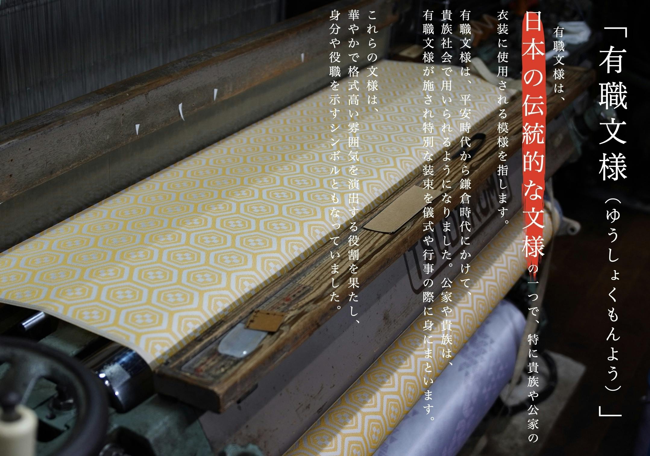 Reperic(再生ペットボトル繊維)で織りなされた西陣織のデザイン・柄は《有職文様》という文様のデザインです。