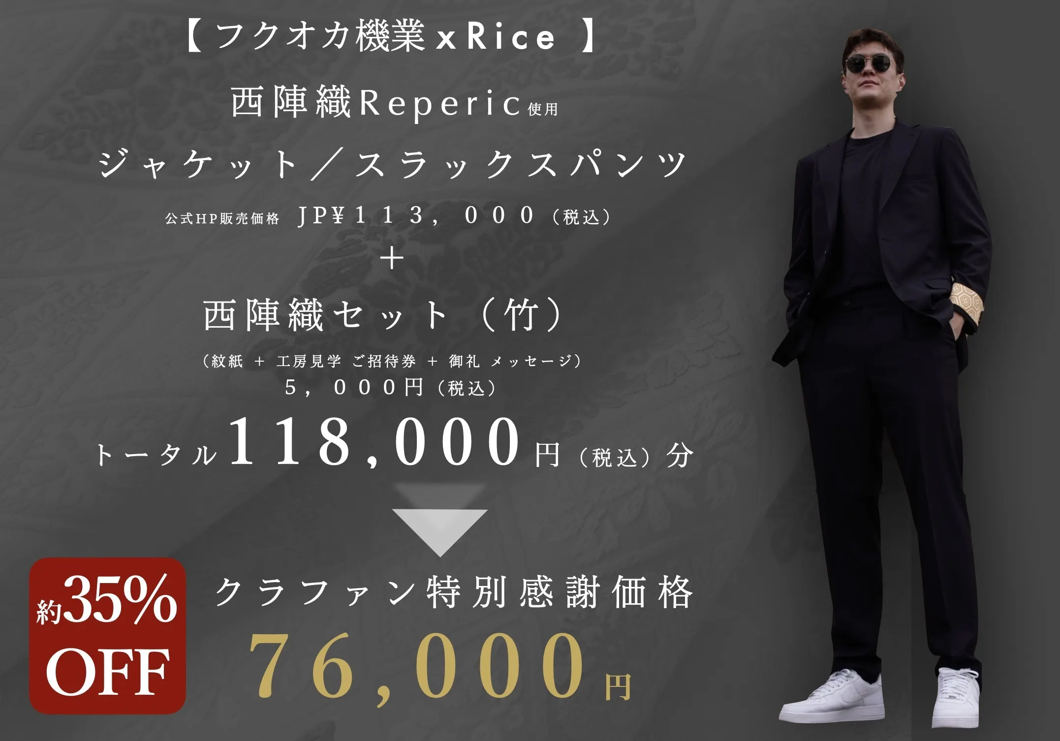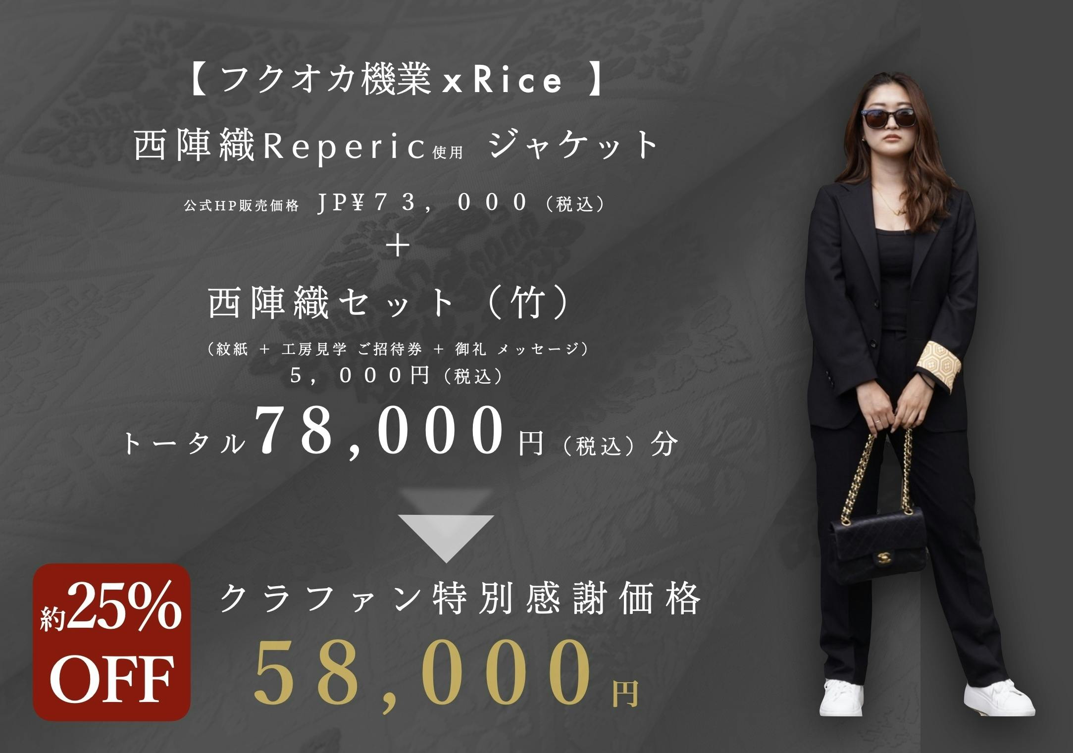 今回Riceさんにリサイクルペットボトル繊維の織物をオーダースーツにご採用頂き、より多くの方に着用頂き、西陣のものづくりを身近に感じて頂ければ幸いです。特に若い世代の方にも愛用して頂けると確信しています。