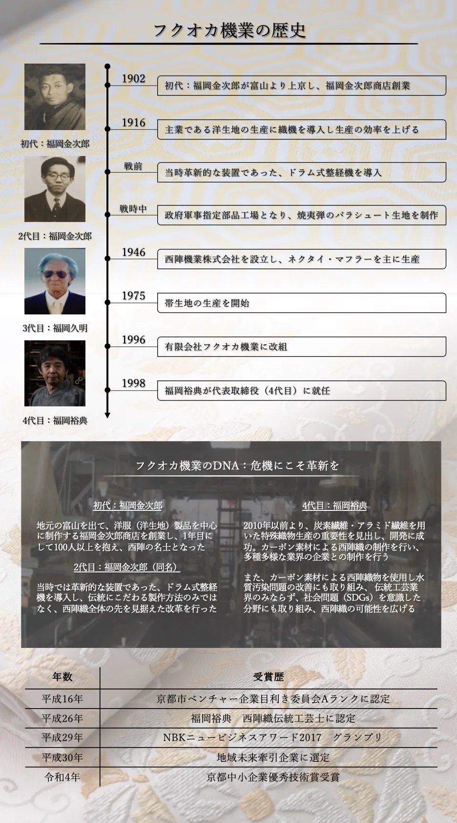 福岡さん)初代は富山から京都に出てきては、地元の名士として西陣で活躍をし、2代目も当時では革新的な織機を導入するなどかなりチャンレンジ精神の強い企業だと考えております。