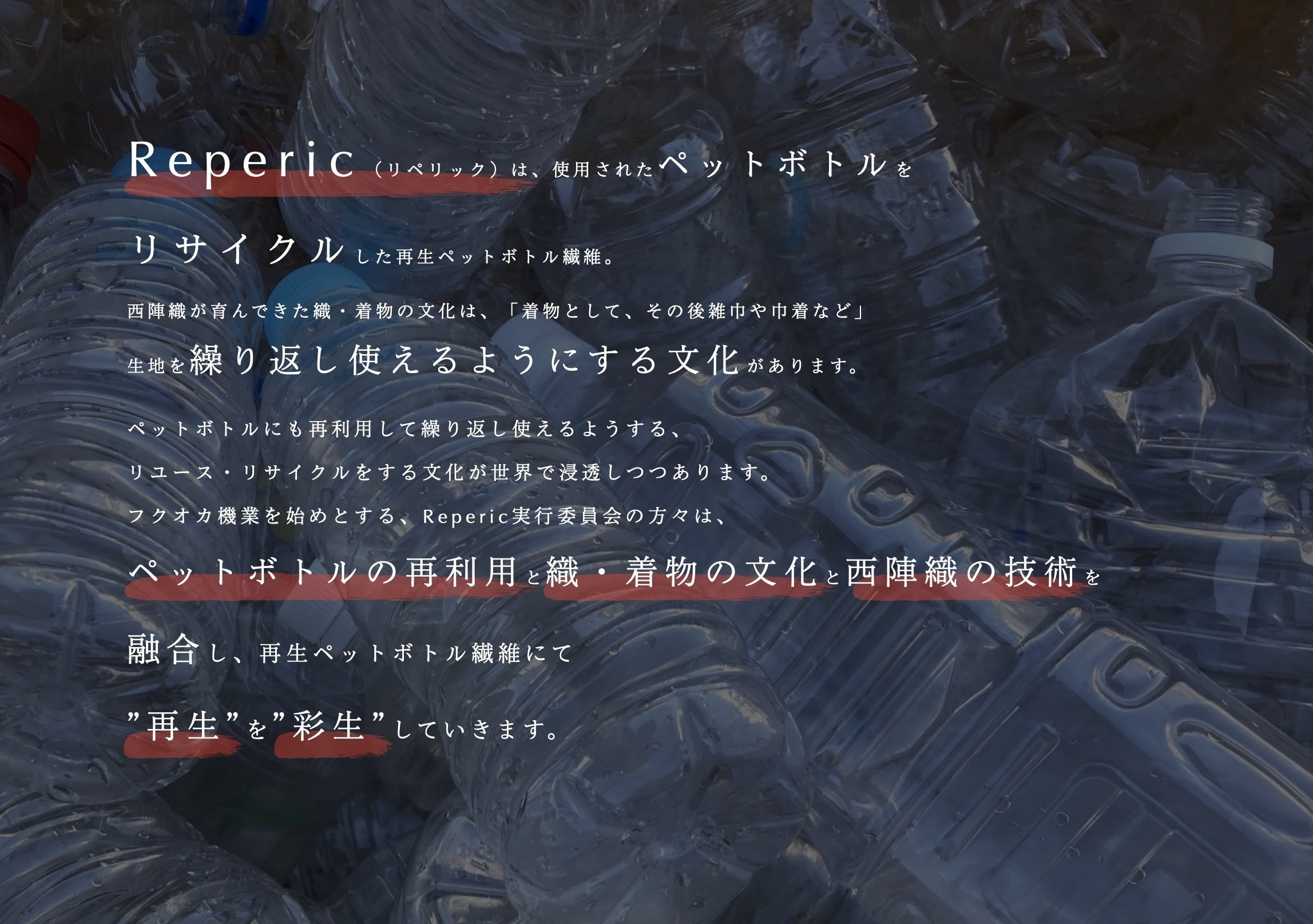 着物文化は”繰り返し使う”ことを目的とした設計で、古来よりサスティナビリティの象徴とされてきました。衰退の進む伝統産業にも、持続可能性とサスティナビリティをもたらすべく、再生ペットボトル繊維織物【Reperic(素材に再生ペットボトルを使用した西陣織)】の製作にフクオカ機業は取り組まれております。