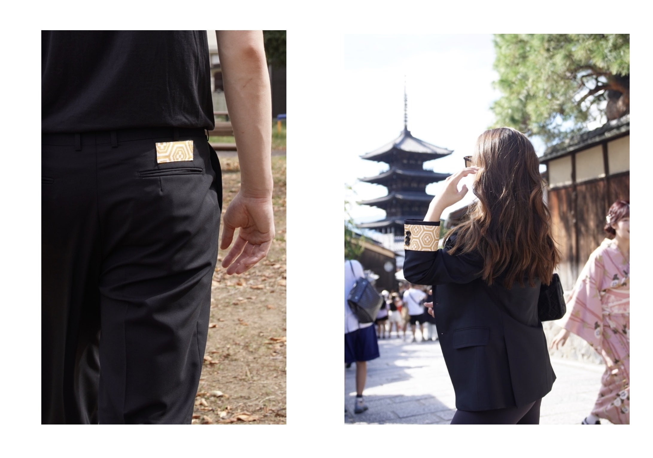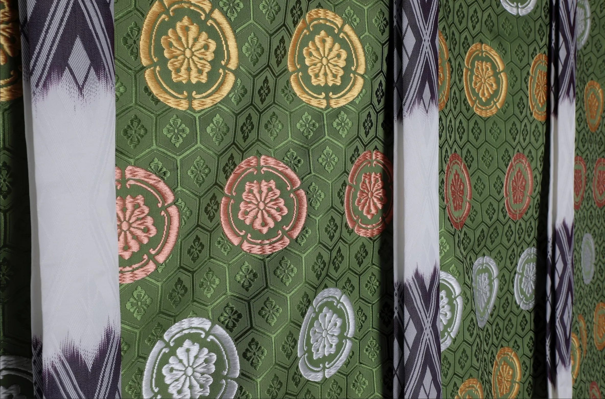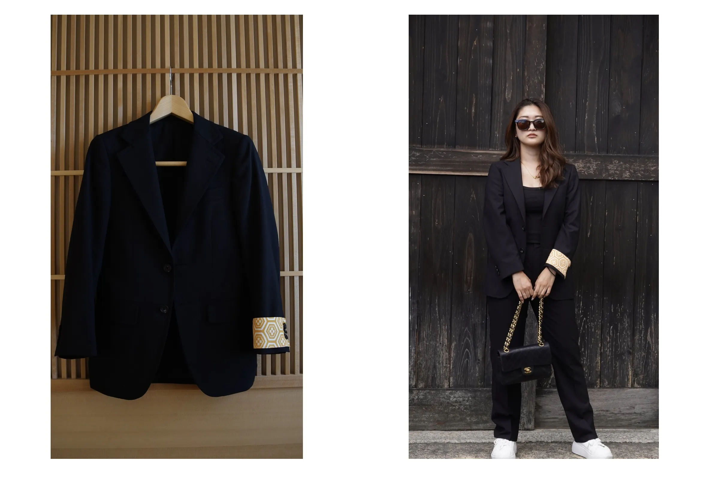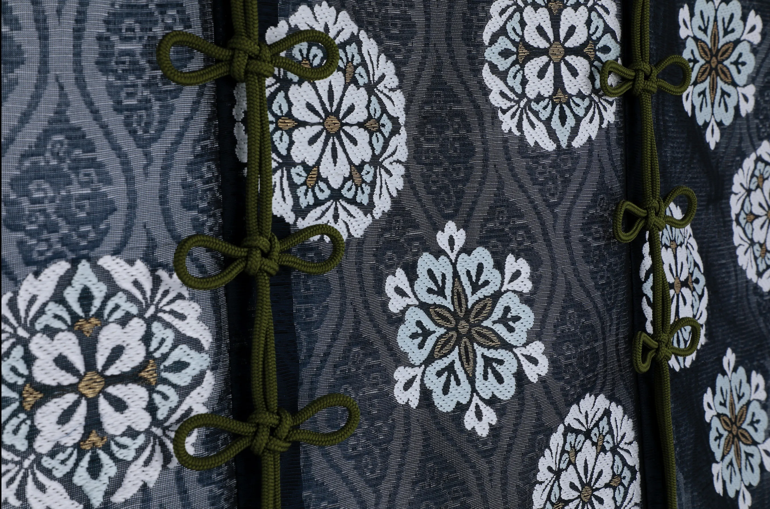 左袖と右腰に、フクオカ機業の西陣織をアタッチメントしました。