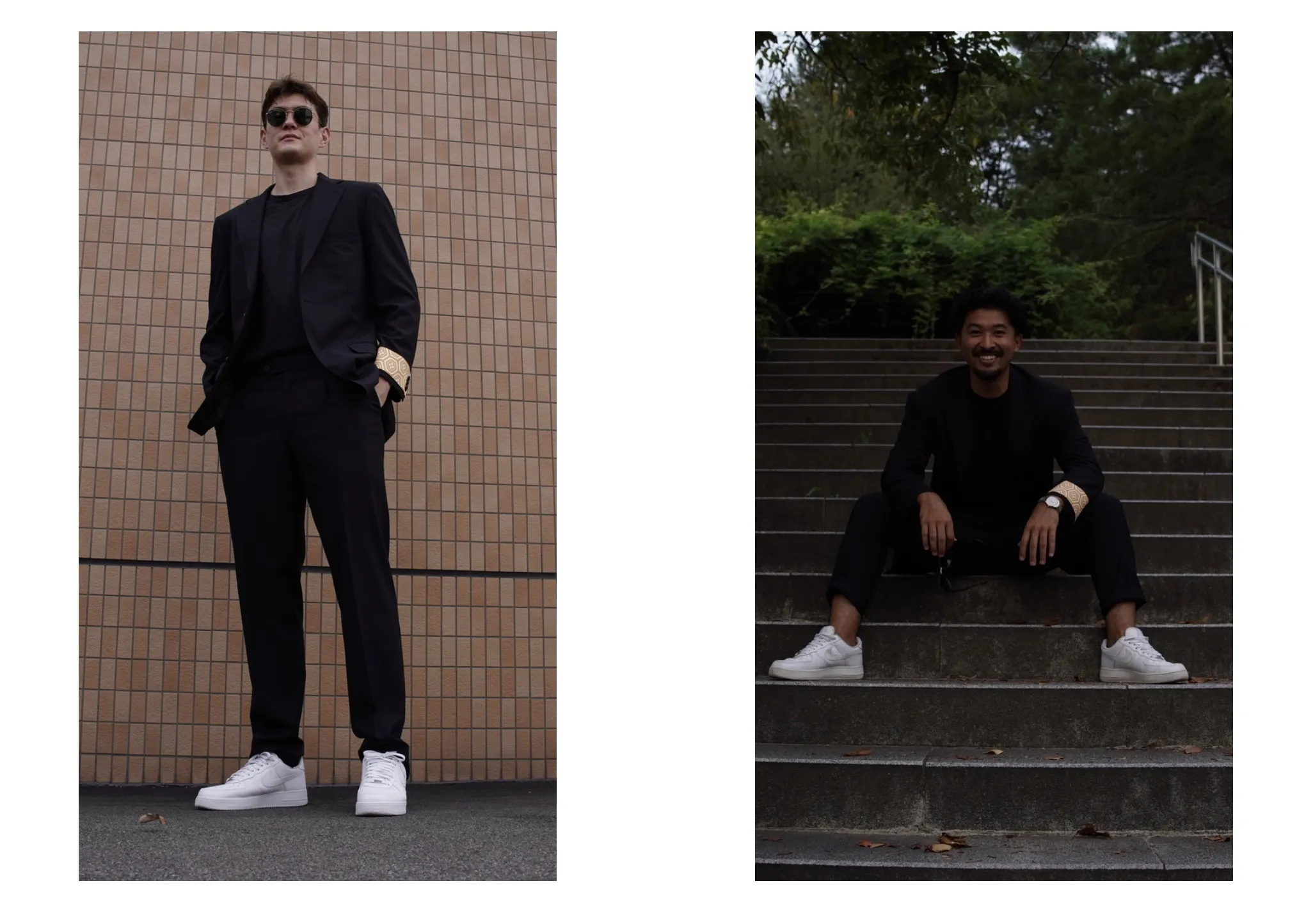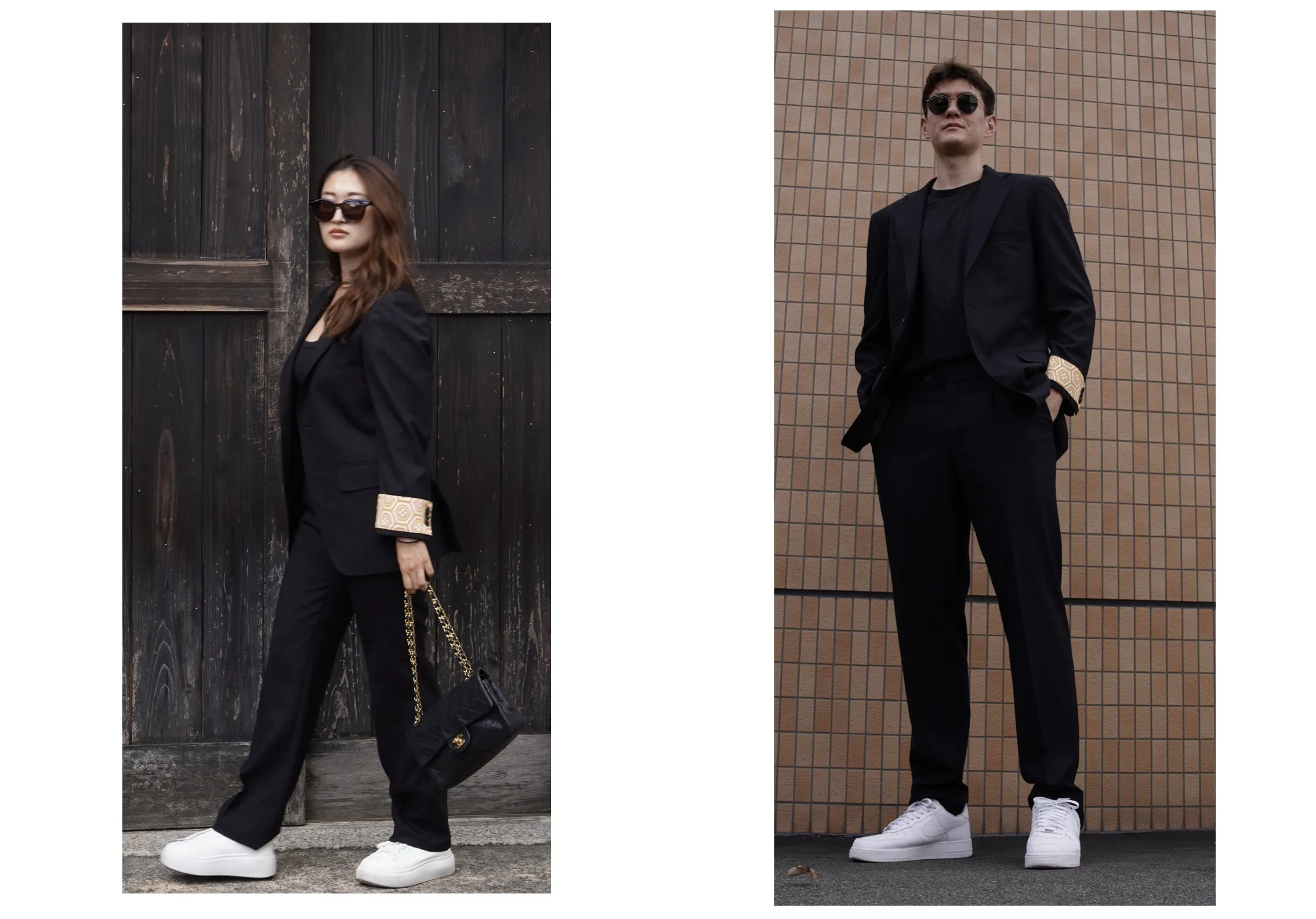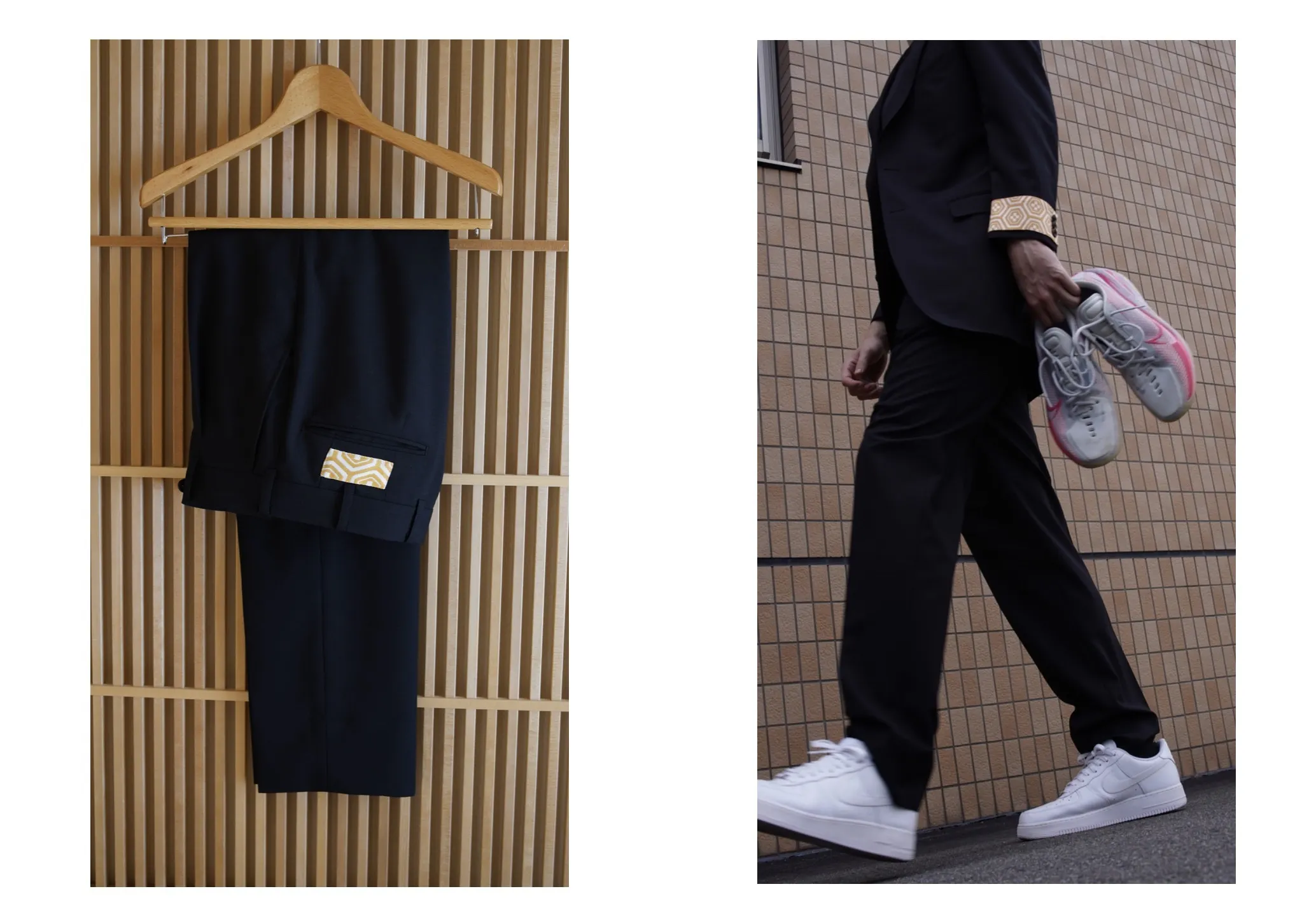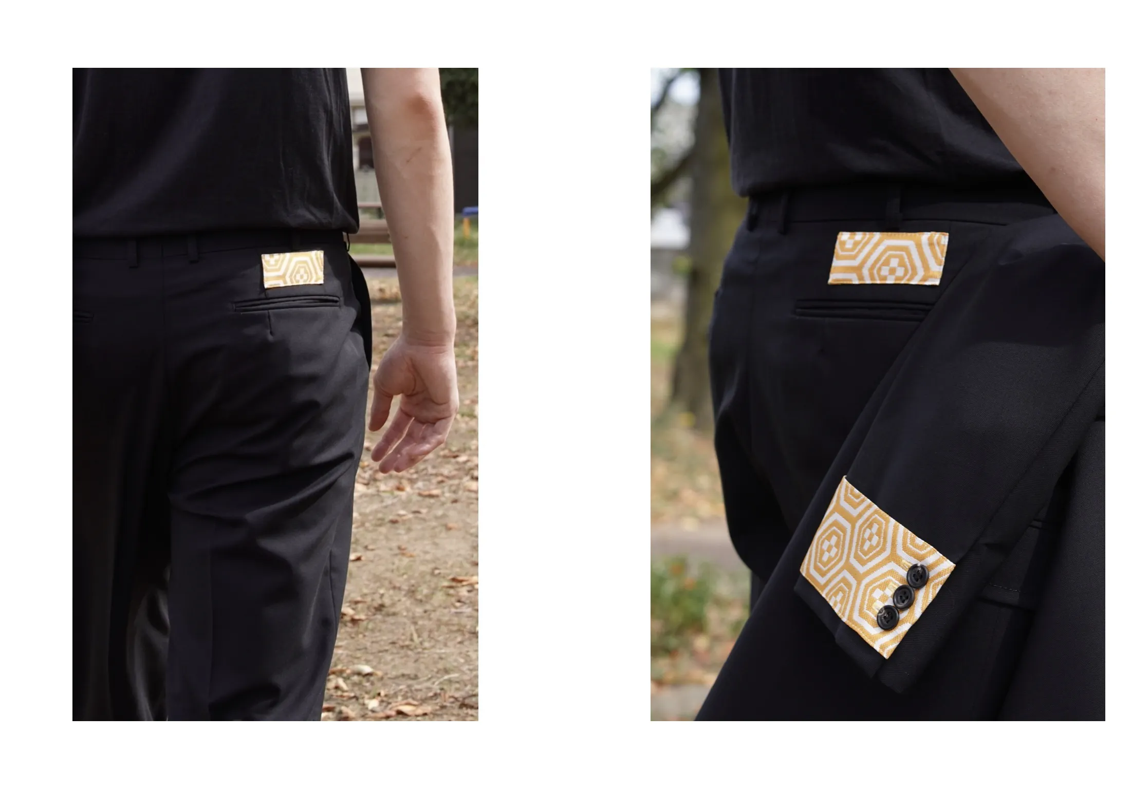 テーラードジャケットとスラックスパンツの良さである、上質さと品格は損なわず、シンプルなデザインの中に西陣織の彩りを取り入れました。今回のジャケットもスラックスパンツはどんなコーディネート、組み合わせでも調和します。モノトーンのコーディネート、シンプルなコーディネート、ストリート系のコーディネートなど。