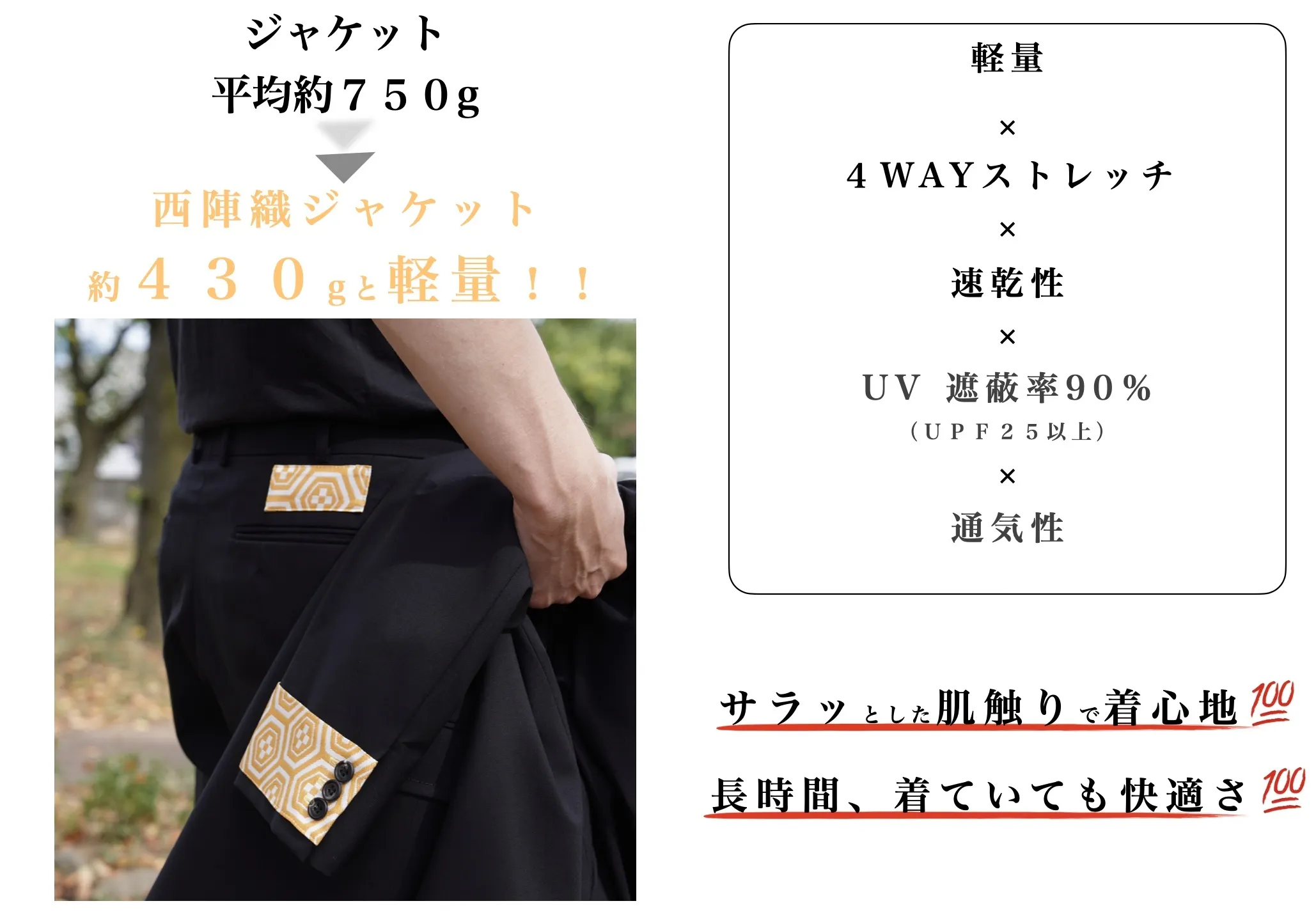 フワッと軽量でスッと動きやすい西陣織ジャケットとスラックスパンツは、