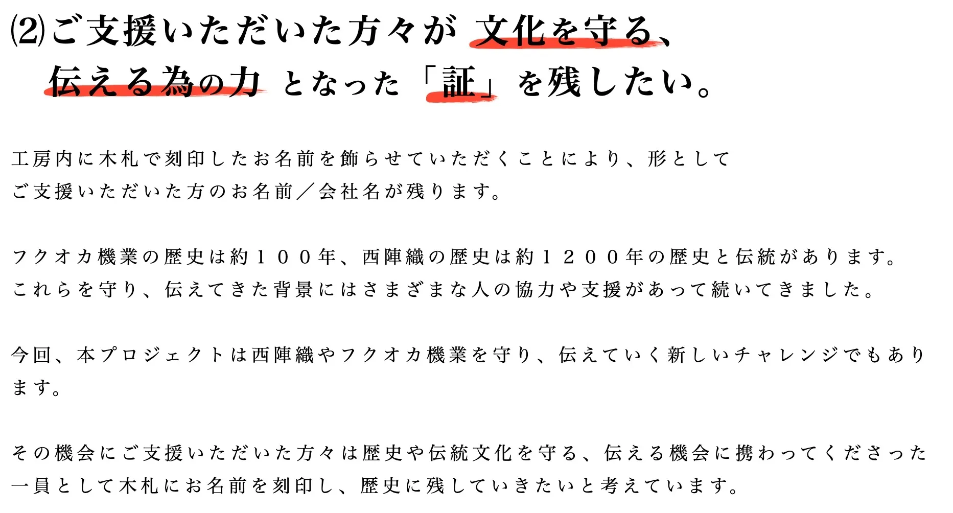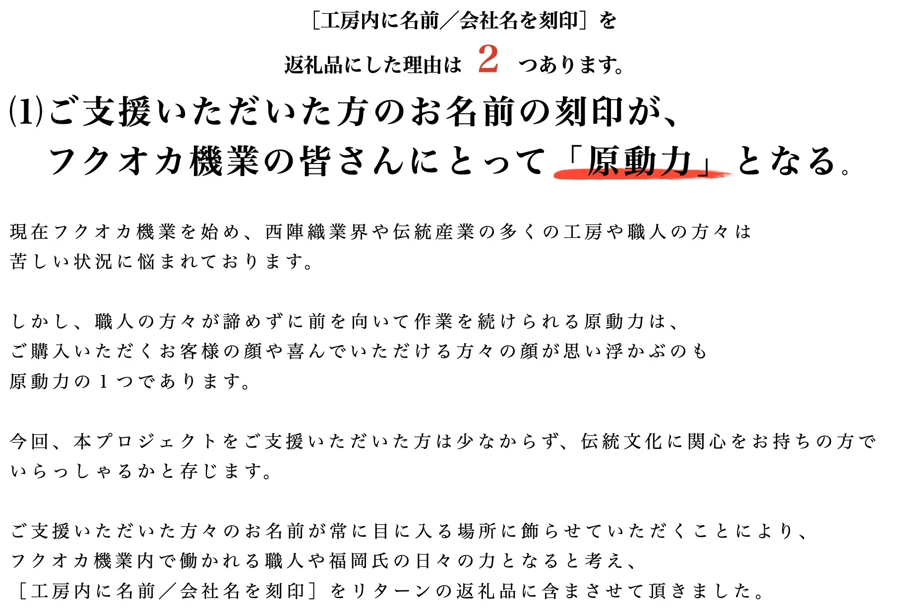 皆様からのご支援が、フクオカ機業と今後の文化を守る為の「支え」となっています。