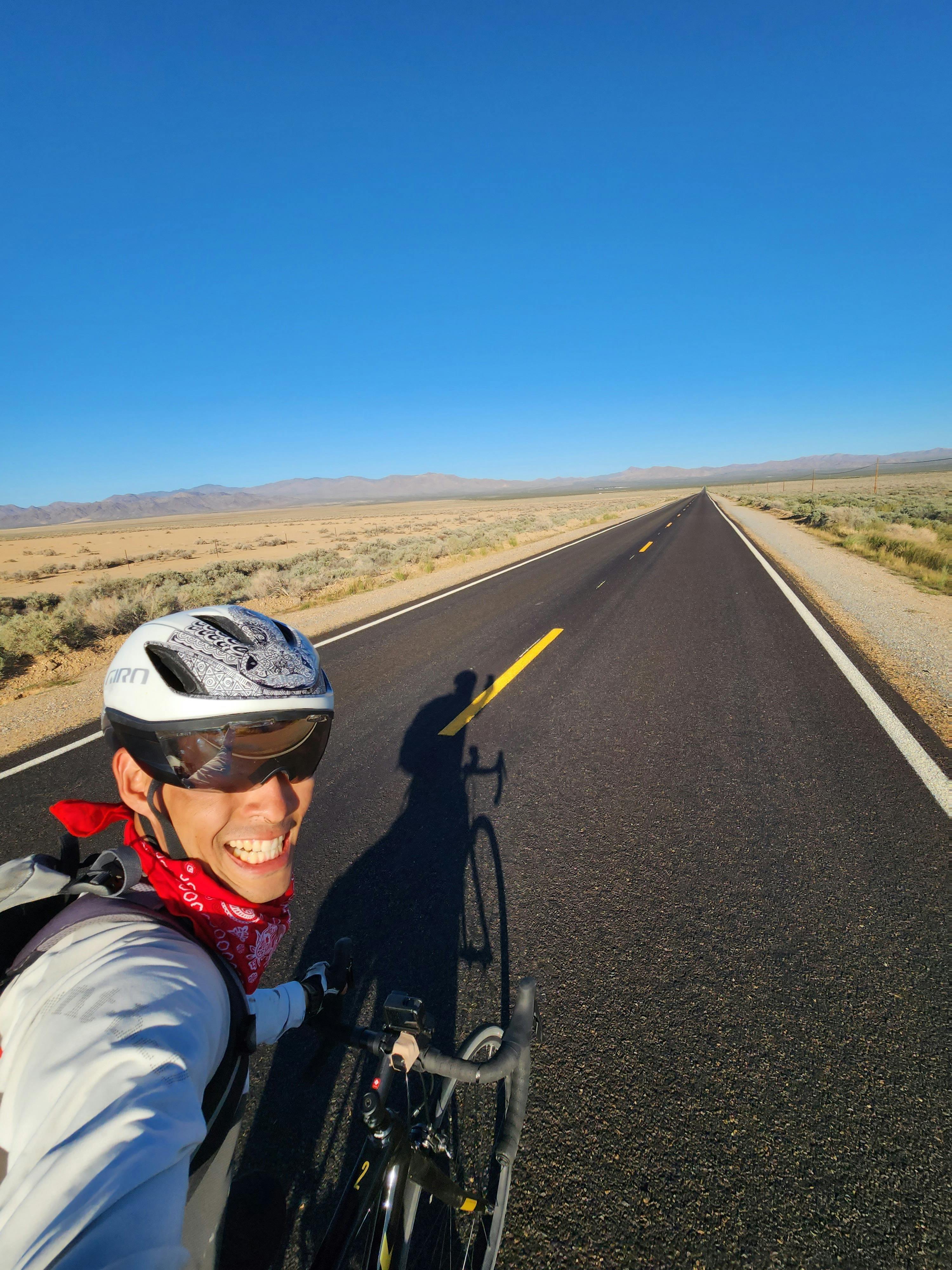 無補給地帯を走りました。地平線の先まで続くルート66をまっすぐ走り続けるだけです。一ヵ所だけガソリンスタンド(コンビニ)があるので、10/7分の水や食料も購入するととんでもない重さの自転車となりました。当初アンボーイクレーター(火山)を目的地にしていましたが、まだ走れる時間と体力があったので先に進むことにしました。夕暮れ時に花崗岩の山の麓でテントを張り、飯を食べると一瞬で外は暗くなりました。テントの中で早く寝ようとしましが、息が苦しくてテントの外に顔を出すと、眩い銀河が空一面に横たわっていました。今まで見たどの星空よりも綺麗で、少しの間見とれていました。この日の過酷な道のりを思い出すと少しだけ泣きそうになりました。本当は明日の分として4L予備としておいたのですが、あまりにものどが渇いて朝には残り3Lになっていました。10/7は完全無補給地帯なはずなので、じわじわと怖くなりました。